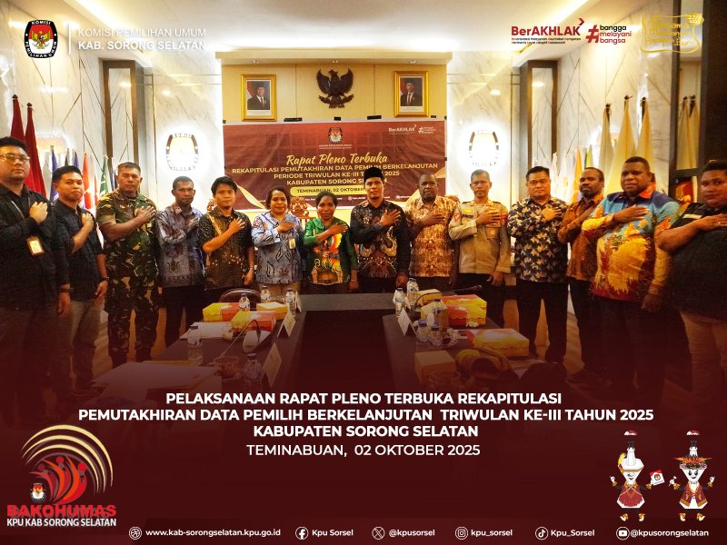 #Temanpemilih, Kamis(02/10/2025) KPU Kab Sorong Selatan melaksanakan Rapat Pleno Terbuka Rekapitulasi Pemutakhiran Data Pemilih Berkelanjutan (PDPB) Triwulan ke-3 Tahun 2025. Kegiatan ini berlangsung di Aula Kantor KPU Kabupaten Sorong Selatan.