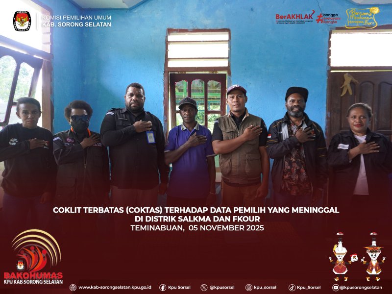 #Temanpemilih, Rabu (05/11/2025), tim KPU Kab. Sorong Selatan yang terdiri atas Kadiv Rendatin dan Teknis Penyelenggara, Syadzali Umaternate, Plt. Sekretaris KPU Kab. Sorong Selatan, Fredrik Kalilago, kasubag Hukum dan Teknis Penyelenggara, Maria Levina Sesa beserta staf sekretariat, melakukan kegiatan Coktas (Coktlit Terbatas) di wilayah distrik Salkma dan Fkour, tepatnya dikampung, Wenslolo, Mlabolo dan Wandum.