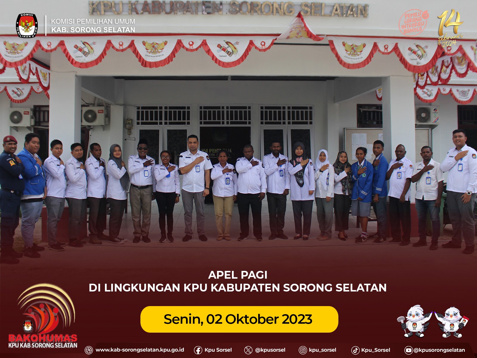 #Temanpemilih, KPU Kab. Sorong Selatan melaksanakan apel rutin pada senin (02/10/2023), pagi di halaman kantor. Apel diikuti oleh komisioner dan jajaran sekretariat KPU Kab. Sorong Selatan. Pembina apel adalah Sekretaris KPU Kab. Sorong Selatan, Mohammad Rusdi, yang dalam arahannya, menyampaikan agar seluruh staf tetap semangat dan lebih ditingkatkan lagi kedisiplinan dan soliditas. Beliau mengingatkan kembali agar kesehatan tetap dijaga mengingat jadwal tahapan pemilu yang semakin padat dan krusial.