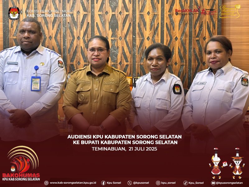 #Temanpemilih,Senin, 21 Juli 2025, KPU Kab. Sorong Selatan mengunjungi kantor Bupati sorong selatan dalam rangka audiensi dengan Bupati Kab. Sorong Selatan. Kegiatan ini merupakan bagian dari upaya KPU dalam mempererat koordinasi. KPU kab. Sorong Selatan juga menyampaikan rencana dan kesiapan menuju pemilu berikutnya, termasuk kebutuhan dukungan pemerintah daerah baik dalam hal koordinasi maupun fasilitasi kegiatan.
