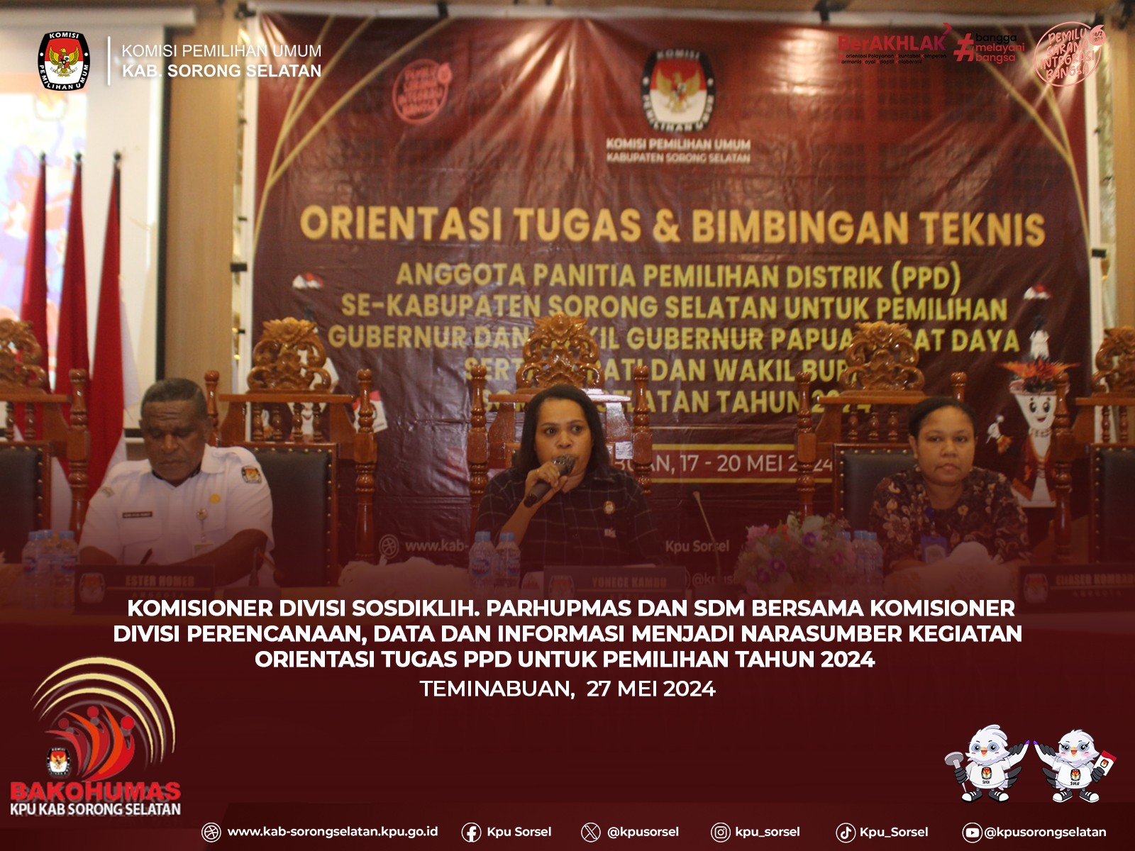 #Temanpemilih, selasa (27/5) Komisioner divisi Sosdiklih, Parhupmas dan SDM, Ester Homer serta Komisioner divisi Perencanaan, data dan informasi, Frederika Muguri, hadir sebagai pemateri pada hari kedua kegiatan orientasi tugas dan bimtek bagi PPD untuk Pemilihan 2024.