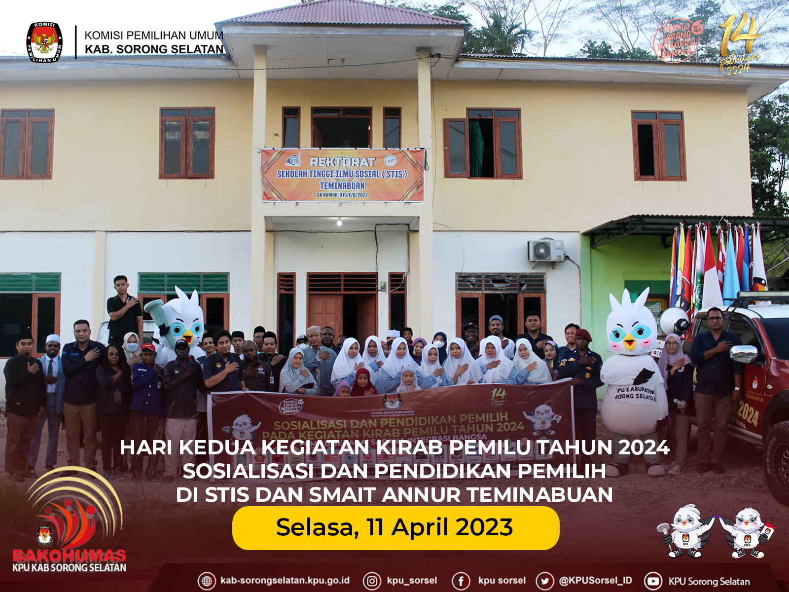 #TemanPemilih, Selasa, 12 April 2023, Hari kedua kirab pemilu tahun 2024 di kabupaten Sorong selatan. Dari universitas werisar, KPU kabupaten Sorong Selatan menuju ke STIS (Sekolah Tinggi Ilmu Sosial) dan SMAIT ANNUR untuk melakukan sosialisasi dan Pendidikan pemilih