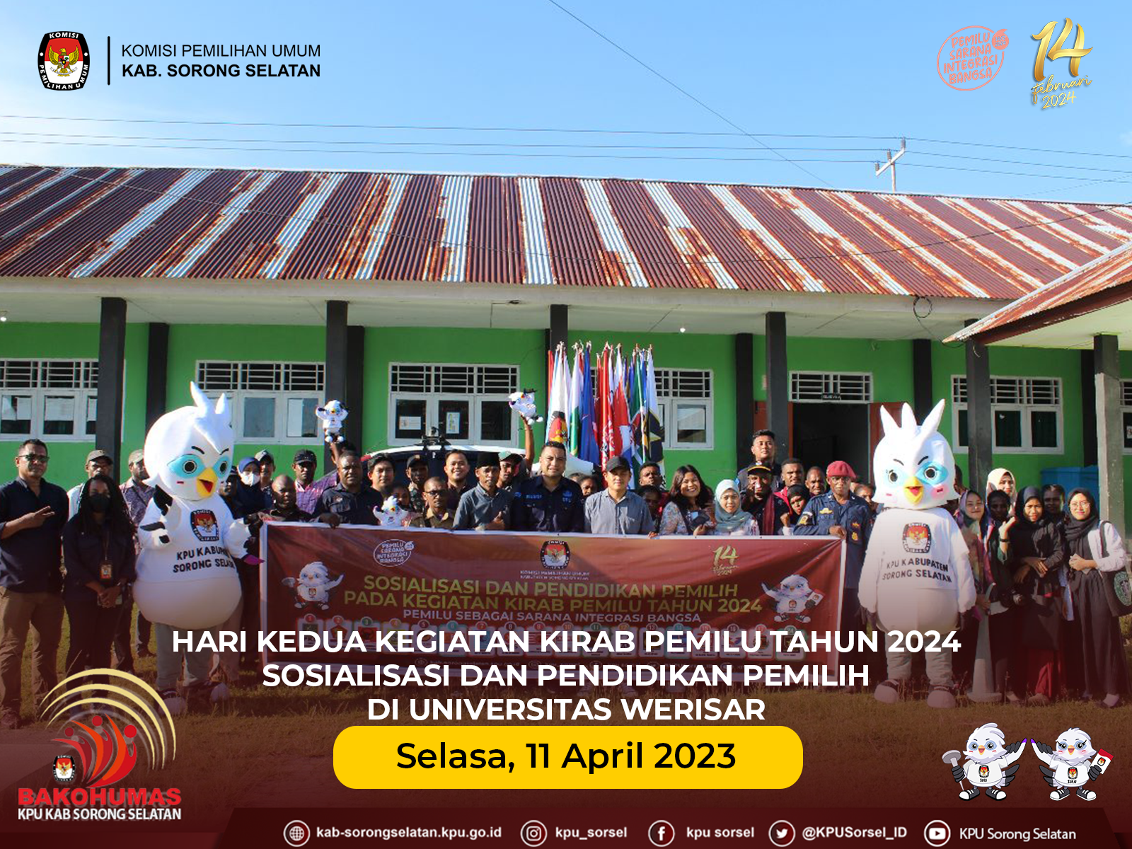 #TemanPemilih, hari Selasa, tanggal 11 April 2023, KPU Kabupaten Sorong Selatan melakukan sosialisasi dan Pendidikan pemilih di Universitas Werisar, Teminabuan Kabupaten Sorong Selatan. Kegiatan sosialisasi diisi dengan pembagian brosur tentang hari pemungutan suara, cekdptonline, dapil dan alokasi kursi DPRD di Kabupaten Sorong Selatan, 18 partai politik peserta pemilu tahun 2024, serta 5 jenis pemilihan pada pemilu serentak. Penyampaian materi sosialisasi oleh plh. Ketua KPU kabupaten Sorong Selatan, Bapak Nahum Krimadi, Kadiv Hukum.