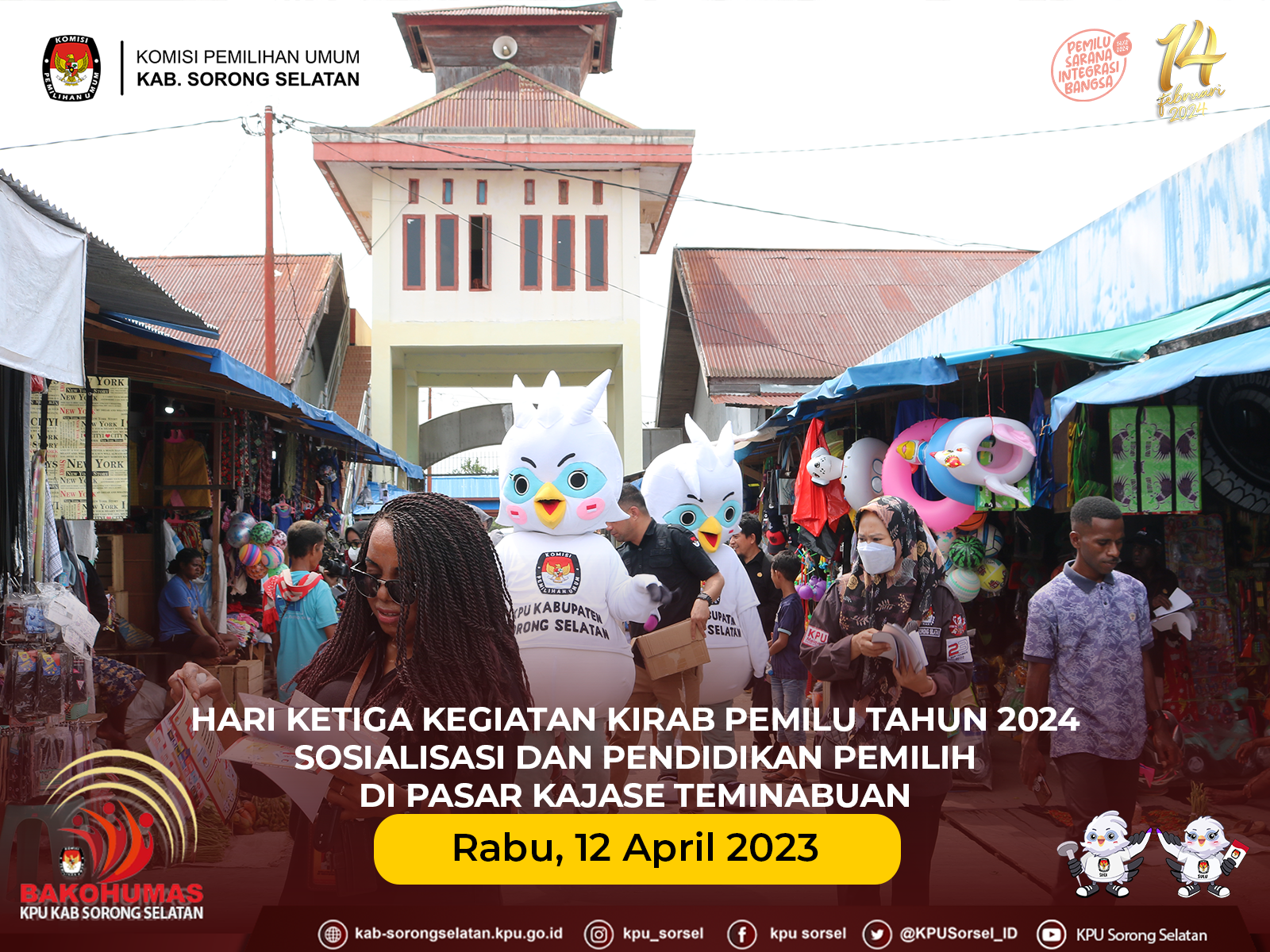 #TemanPemilih, Rabu 12 April 2023, setelah pelaksanaan sosialiasi pendidikan pemilih di sekolah SMA Negeri 1 Teminabuan, tim Kirab Pemilu tahun 2024 KPU Kabupaten Sorong Selatan, melanjutkan sosialisasi dan pendidikan pemilih di Pasar Kajase teminabuan.