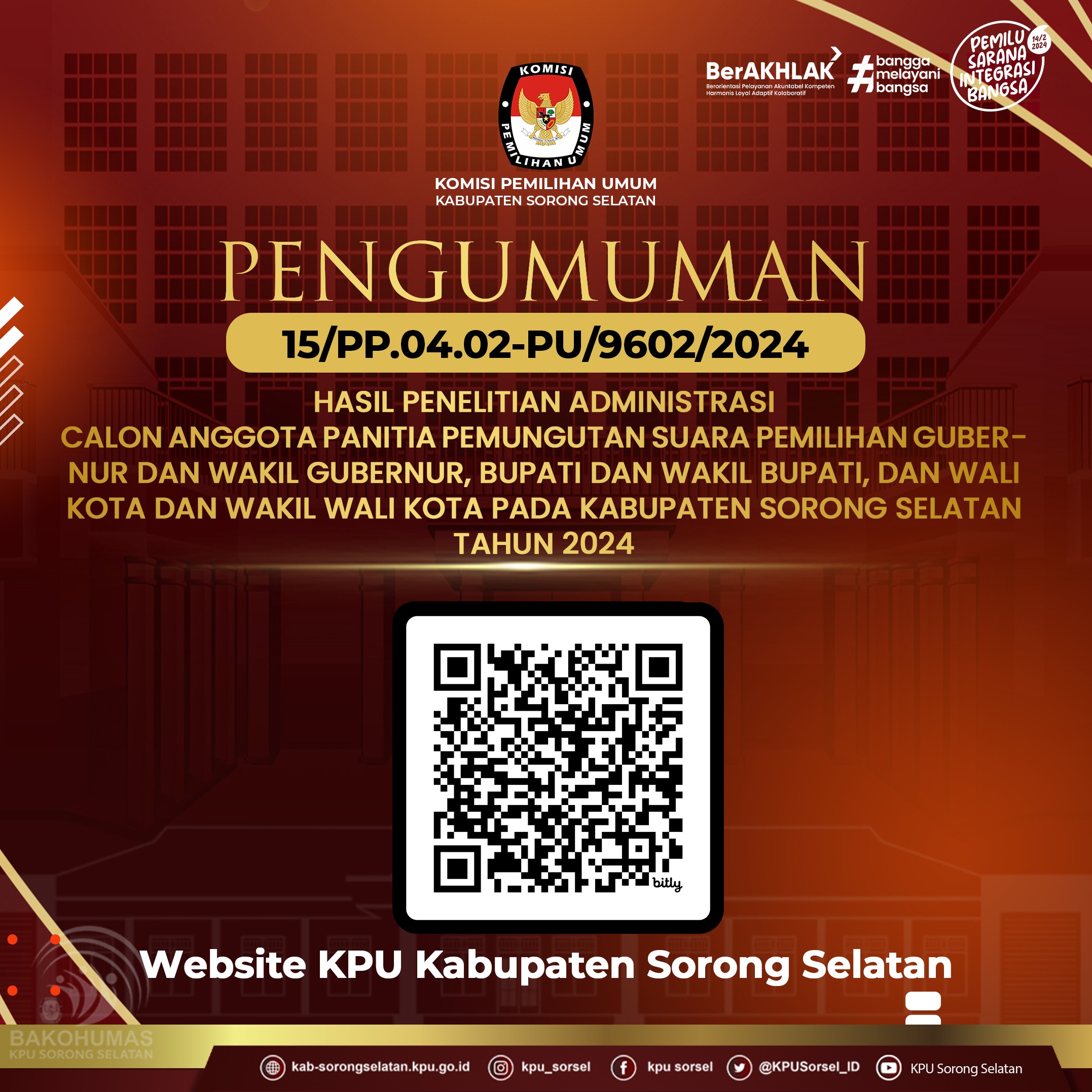 Sehubungan dengan Komisi Pemilihan Umum Kabupaten Sorong Selatan telah melaksanakan tahapan Penelitian Administrasi Calon Anggota Panitia Pemungutan Suara untuk Pemilihan Gubernur dan Wakil Gubernur, Bupati dan Wakil Bupati, dan Wali Kota dan Wakil Wali Kota Tahun 2024, disampaikan beberapa hal sebagai berikut: