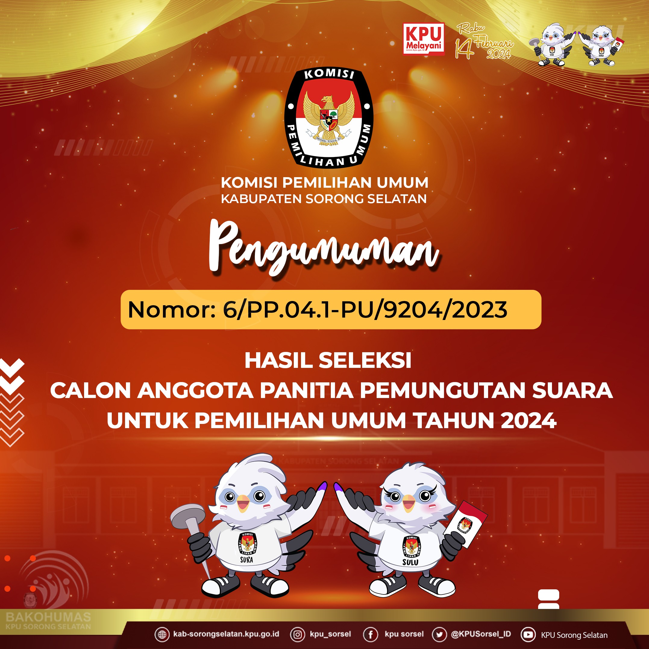 Berdasarkan Berita Acara Pleno KPU Kabupaten Sorong Selatan Nomor 10/PP.04.1-BA/9204/2023 tanggal 23 Januari 2023 tentang Penetapan Hasil Seleksi Calon Anggota Panitia Pemungutan Suara Pada Pemilihan Umum Tahun 2024, disampaikan hal-hal sebagai berikut:
