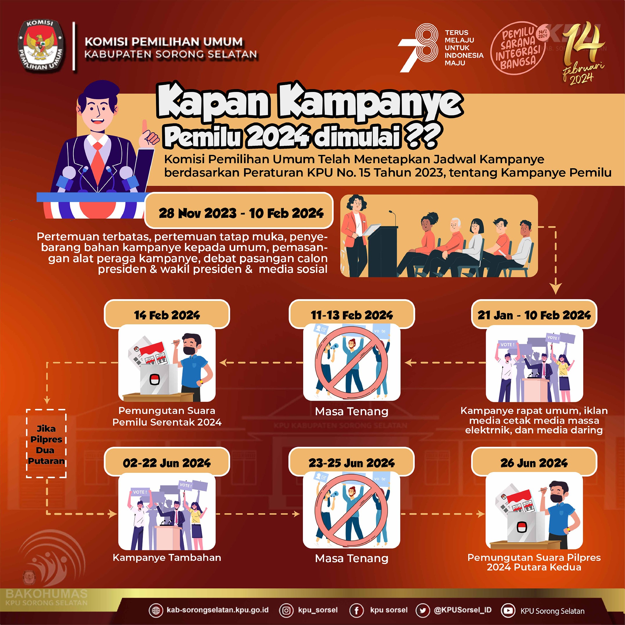 #TemanPemilih, Kapan kampanye Pemilu 2024 dimulai? KPU RI telah menetapkan aturan kampanye Pemilu 2024 melalui PKPU Nomor 15 Tahun 2023 tentang kampanye Pemilu 2024. Yuk, simak infographisnya.