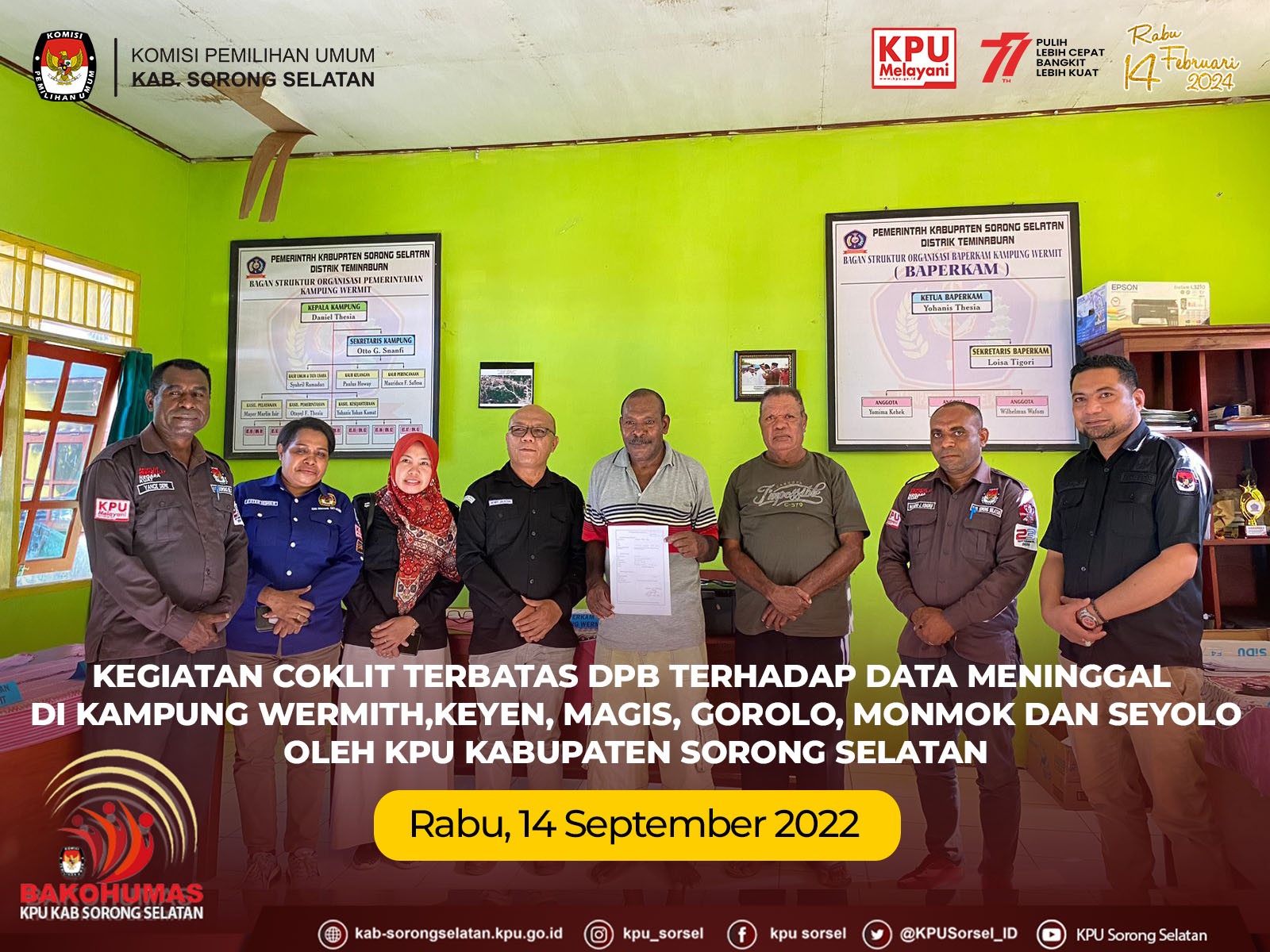 #TemanPemilih, Rabu 14 September 2022, KPU Kab sorong selatan melakukan kegiatan Coklit (Pencocokan dan penelitian) terbatas di beberapa kampung di kabupaten sorong selatan. Ada 6 kampung yang dikunjungi untuk kegiatan Coklit terbatas tersebut, diantaranya adalah kampung wermith,keyen, magis, gorolo, monmok dan seyolo. Kegiatan yang dilakukan hingga sore tersebut difokuskan pada data meninggal.