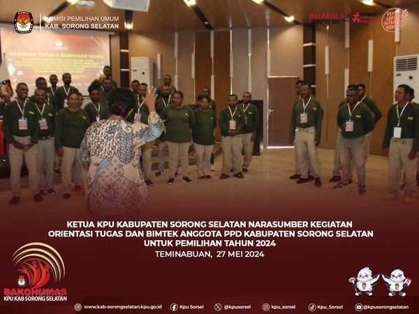 #Temanpemilih, selasa (27/5) Ketua KPU Kab. Sorong selatan, Yonece Kambu, hadir sebagai narasumber pada hari kedua pelaksanaan kegiatan orientasi tugas dan bimtek bagi PPD untuk Pemilihan Gubernur dan Wakil Gubernur serta Bupati dan Wakil Bupati Sorong Selatan tahun 2024. Beliau memaparkan terkait hubungan kelembagaan KPU serta tahapan penyelenggaraan pilkada tahun 2024.