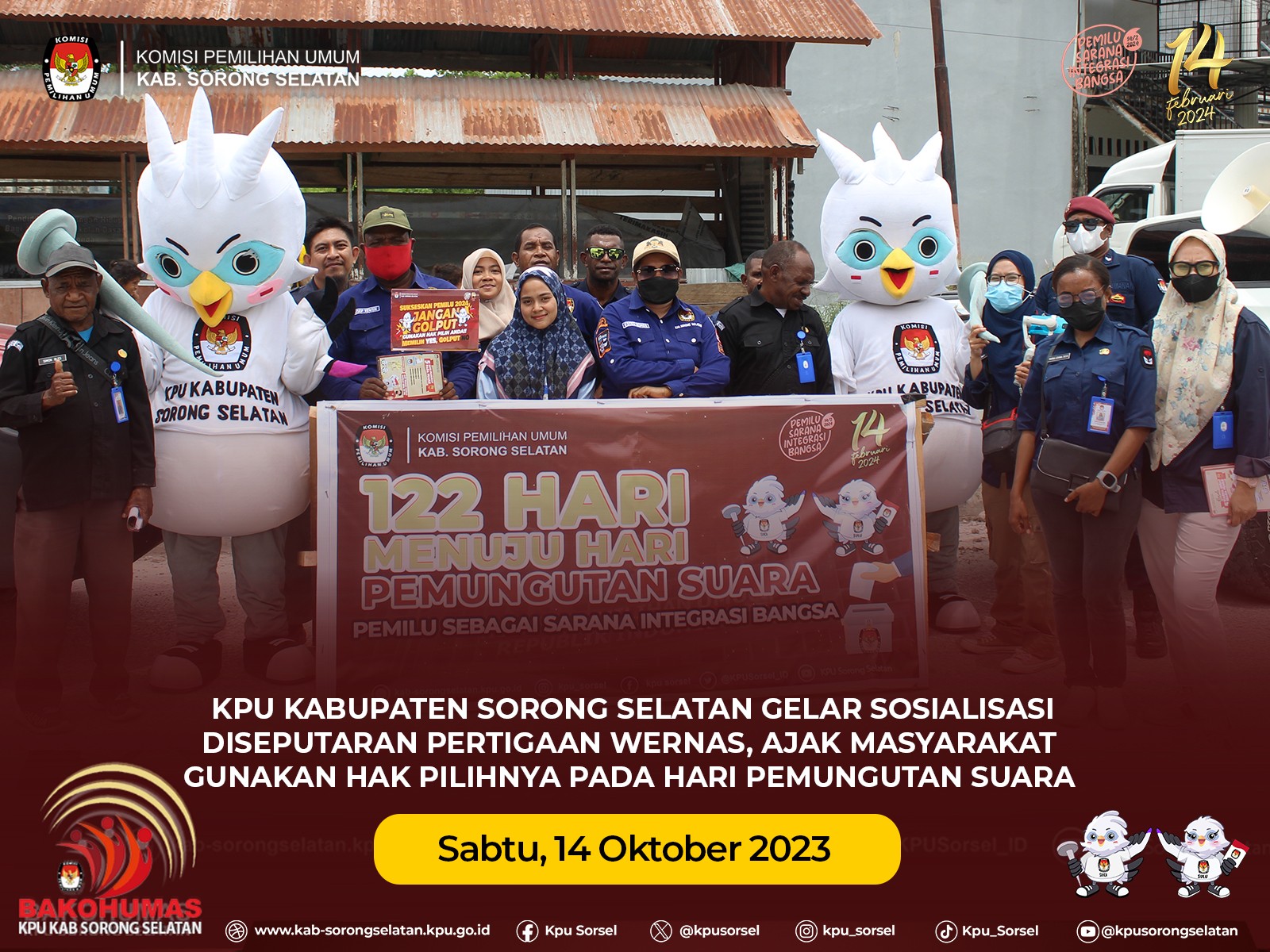 #Temanpemilih, KPU Kab. Sorong Selatan mengajak masyarakat untuk salurkan Hak Pilihnya pada hari pemungutan suara, melalui sosialisasi yang digelar pada sabtu (14/10/2023). Bertemakan 122 hari menuju hari pemungutan suara, kegiatan sosialisasi tersebut dilangsungkan di pertigaan wernas dengan target sasaran para pengendara motor dan mobil serta para pejalan kaki.