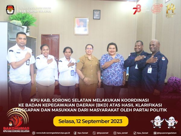 #TemanPemilih, senin (11/09/2023) KPU Kab. Sorong Selatan mengunjungi badan kepegawaian daerah kab. sorong selatan dalam rangka berkoordinasi terkait berita hasil klarifikasi dari partai politik atas masukkan dan tanggapan yang diberikan oleh masyarakat kepada KPU Kab. Sorong Selatan. Koordinasi tersebut dilakukan berdasarkan Keputusan KPU Nomor 1026 Tahun 2023.