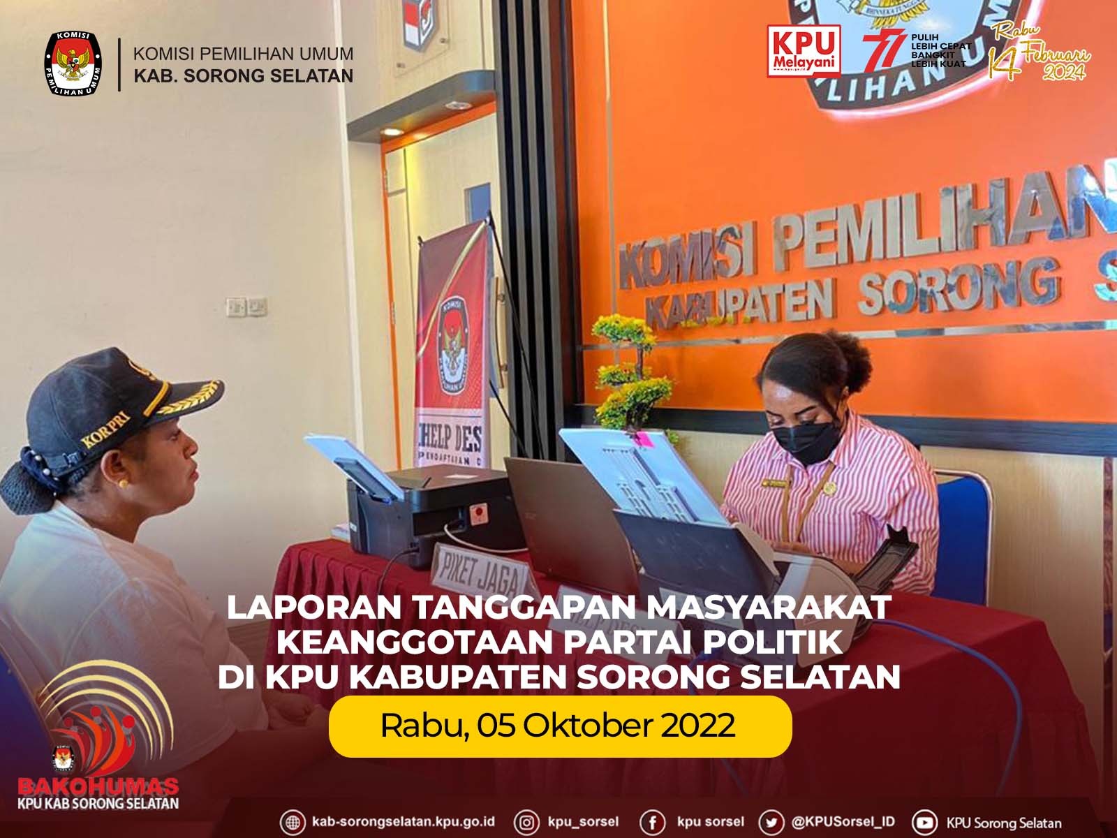 #TemanPemilih, Rabu 5 Oktober 2022, KPU Kabupaten Sorong Selatan kembali menerima laporan tanggapan masyarakat. Tanggapan tersebut merupakan pengaduan dari beberapa masyarakat terkait pencantuman nama dalam keanggotaan partai politik. Hingga saat ini jumlah laporan masyarakat yang masuk sebanyak 8 orang yang berasal dari daerah teminabuan. KPU Kabupaten Sorong Selatan mengharapkan keaktifan dari masyarakat dalam melapor apabila nama mereka terdaftar sebagai partai politik.