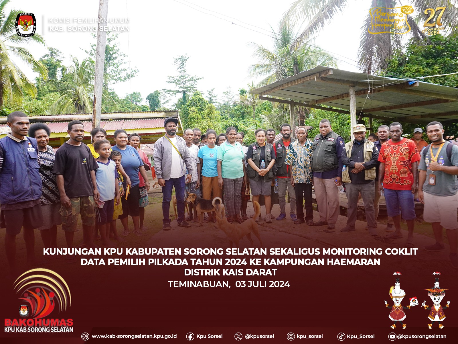 #Temanpemilih, Selasa (02/07/2024) KPU Kab. Sorong Selatan mengunjungi kampung haemaran distrik kais darat. Kunjungan tersebut untuk membahas terkait pelarangan pencoklitan data pemilih pilkada tahun 2024 oleh masyarakat kampung.