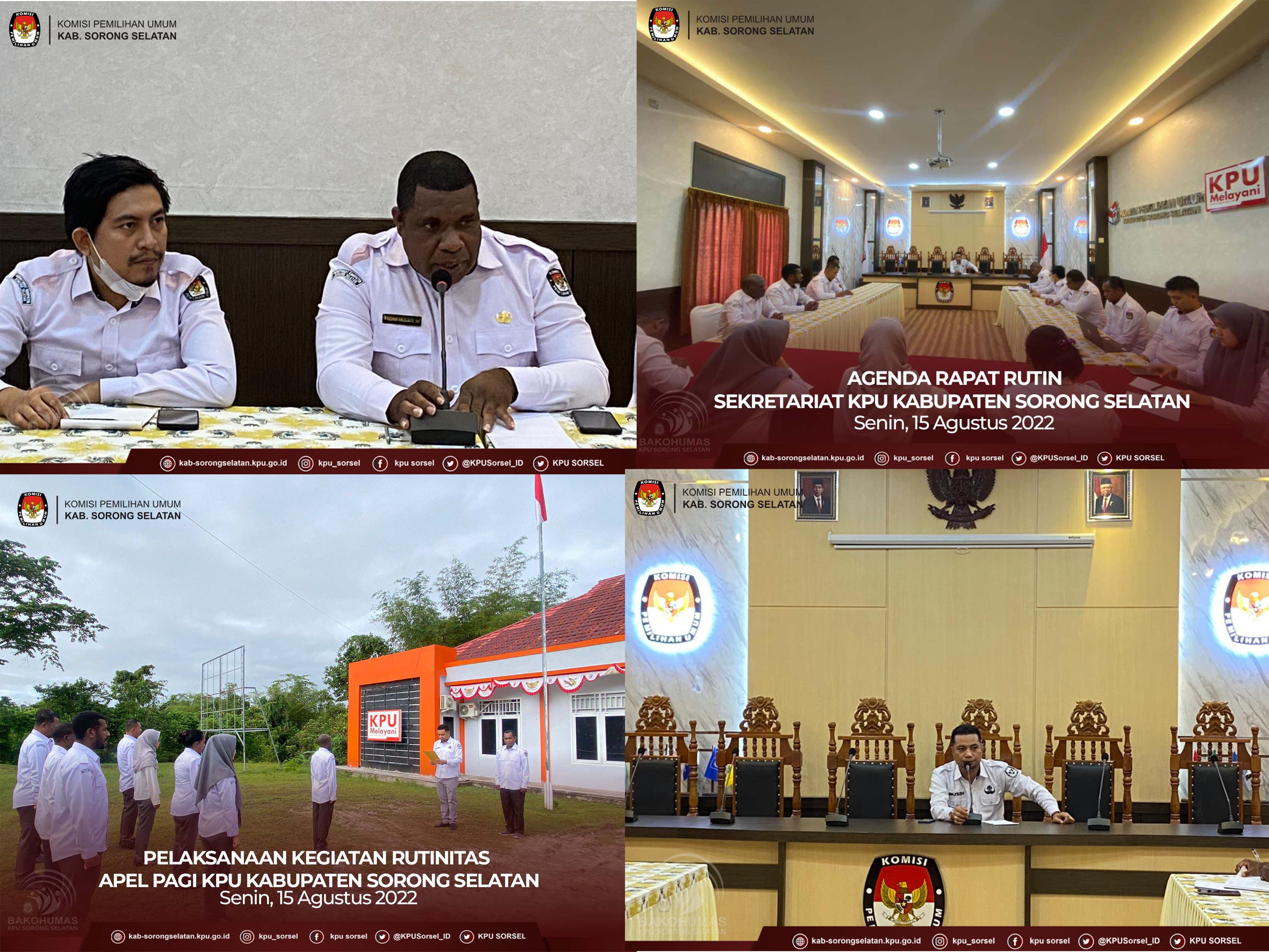 Senin, 15 Agustus 2022, Sekretariat KPU Kab Sorong Selatan melaksanakan kegiatan rutin seperti apel pagi dan rapat koordinasi. Kedua kegiatan tersebut dipimpin langsung oleh kepala sekretaris KPU Kab Sorong Selatan, Moh Rusdi, S.H dan dihadiri oleh seluruh staf dan jajaran devisi di KPU sorong selatan. Dalam agenda rapat koordinasi, bapak sekretaris berdiskusi dan membahas beberapa point penting yang diantaranya terkait persiapan persiapan pelaksanaan verifikasi administrasi partai calon peserta pemilu tahun 2024. Pelaksanaan keigatan verifikasi tersebut dicanangkan akan dilaksanakan dalam waktu dekat. Sehingga bapak sekretaris meminta untuk setiap kepala divisi agar dapat membantu mempersiapkan pelaksanaan kegiatan verifikasi tersebut. Diharapkan juga setiap staf juga ikut turun membantu pelaksanaan kegiatan tersebut