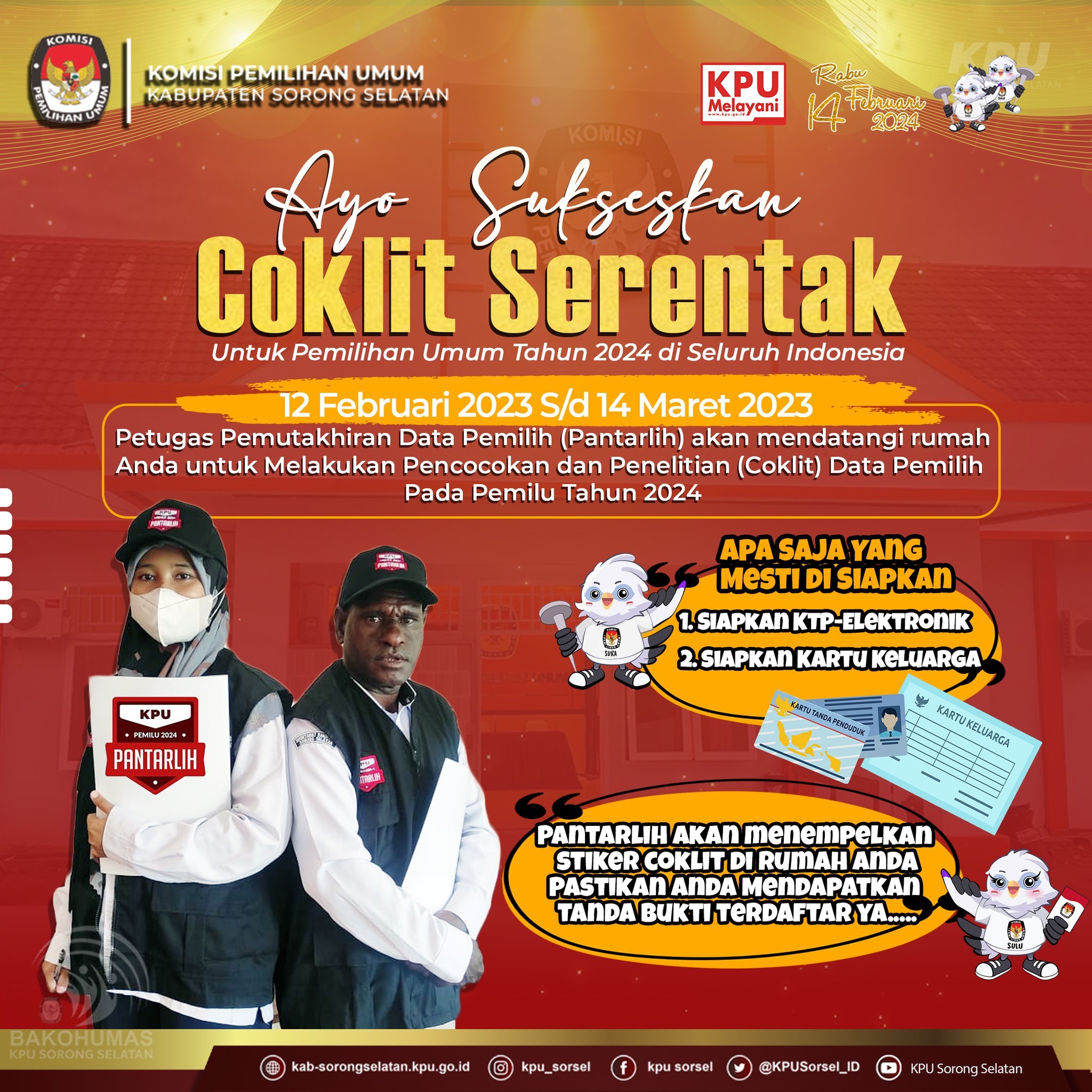 #TemanPemilih, khususnya warga masyarakat di kabupaten sorong selatan, Petugas Pemutakhiran Data Pemilih (Pantarlih) akan berkunjung ke rumah Anda untuk melakukan proses pencoklitan.