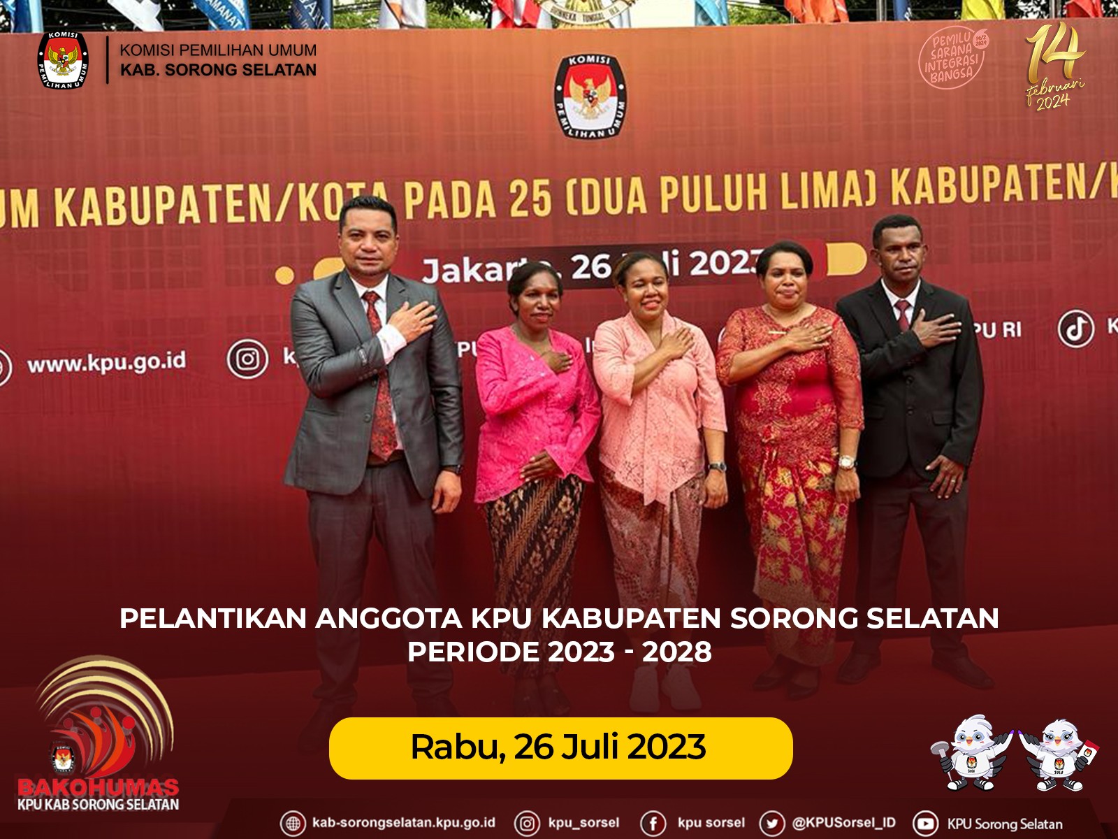 #TemanPemilih, rabu (26/07/2023), di halam kantor KPU, Ketua KPU Hasyim Asy’ari, Anggota KPU Parsadaan Harahap, August Mellaz, Mochammad Afifuddin, dan Idham Holik bersama Sekretaris Jenderal KPU Bernad Dermawan Sutrisno melantik Anggota KPU Kabupaten/Kota pada 25 Kabupaten/Kota di 5 Provinsi untuk Periode 2023-2028. Diantaranya adalah Anggota KPU dari Kabupaten Sorong Selatan.
