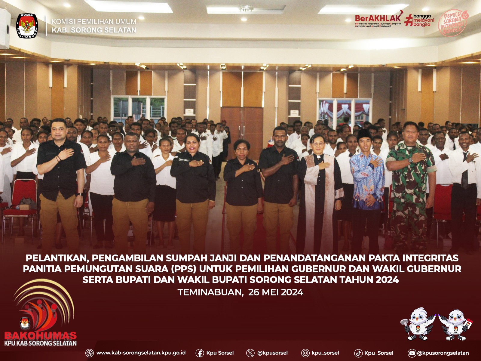 #Temanpemilih, Sebagai langkah persiapan menjelang Pemilihan Kepala Daerah (Pilkada) 2024, KPU kab. Sorong Selatan mengadakan acara pelantikan, pengambilan sumpah janji dan penandatanganan pakta integritas bagi Panitia Pemungutan Suara (PPS) se-Kabupaten Sorong Selatan. Acara ini berlangsung di Aula Hotel Mratua Sesna dan dihadiri oleh seluruh anggota