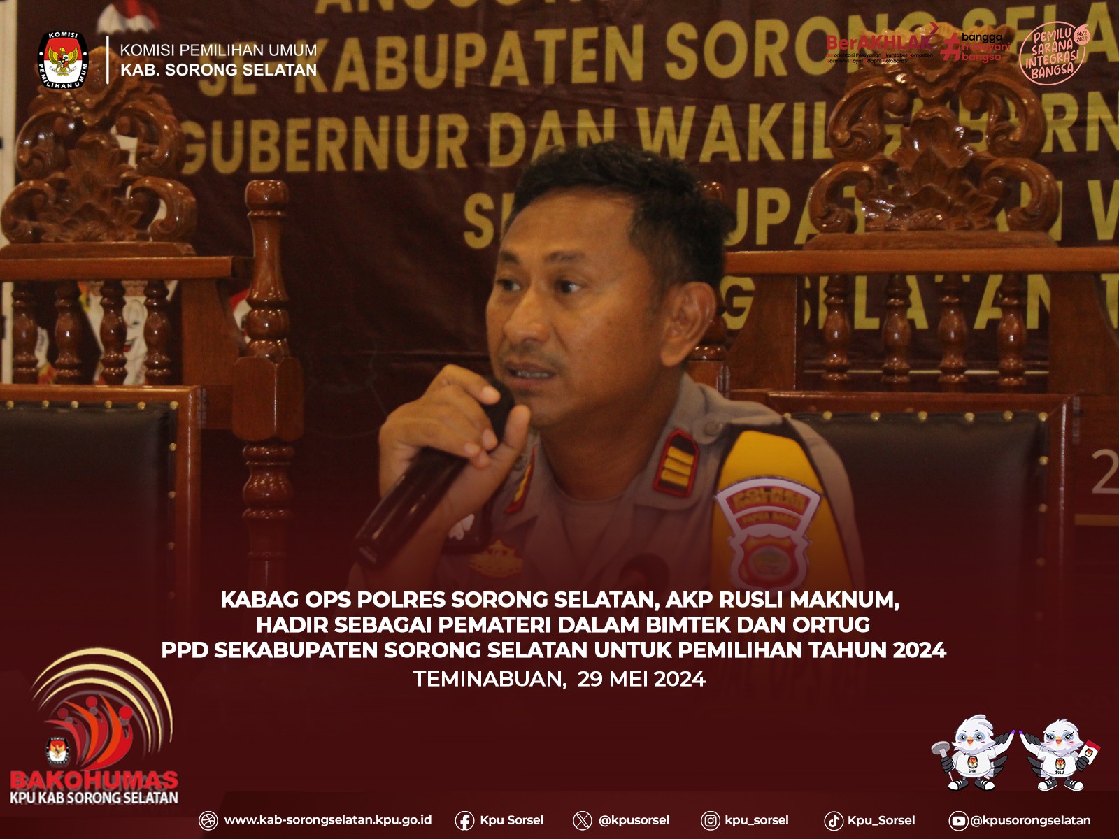 #Temanpemilih, rabu (29/5) Kabag ops polres sorong selatan, AKP Rusli Maknum, hadir sebagai pemateri dalam kegiatan orientasi dan bimtek bagi PPD sekabupaten sorong selatan untuk pemilihan tahun 2024.
