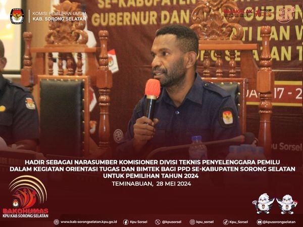#Temanpemilih, selasa (28/5) Komisioner divis teknis penyelenggara pemilu, Eliaser Kombado hadir memberikan materi terkait tahapan krusial dalam Pilkada 2024. Beliau menekankan kepada PPD agar banyak membaca aturan, keputusan dan juga surat dinas yang dikeluar oleh KPU RI, untuk menjadi petunjuk bagi PPD dalam melaksanakan Tahapan. Selalu melakukan koordinasi dan komunikasi dengan kPU kabupaten Sorong Selatan, apabila ada hal yang masih kurang dimengerti terkait tahapan. (humas kpu patma/foto: dinda)