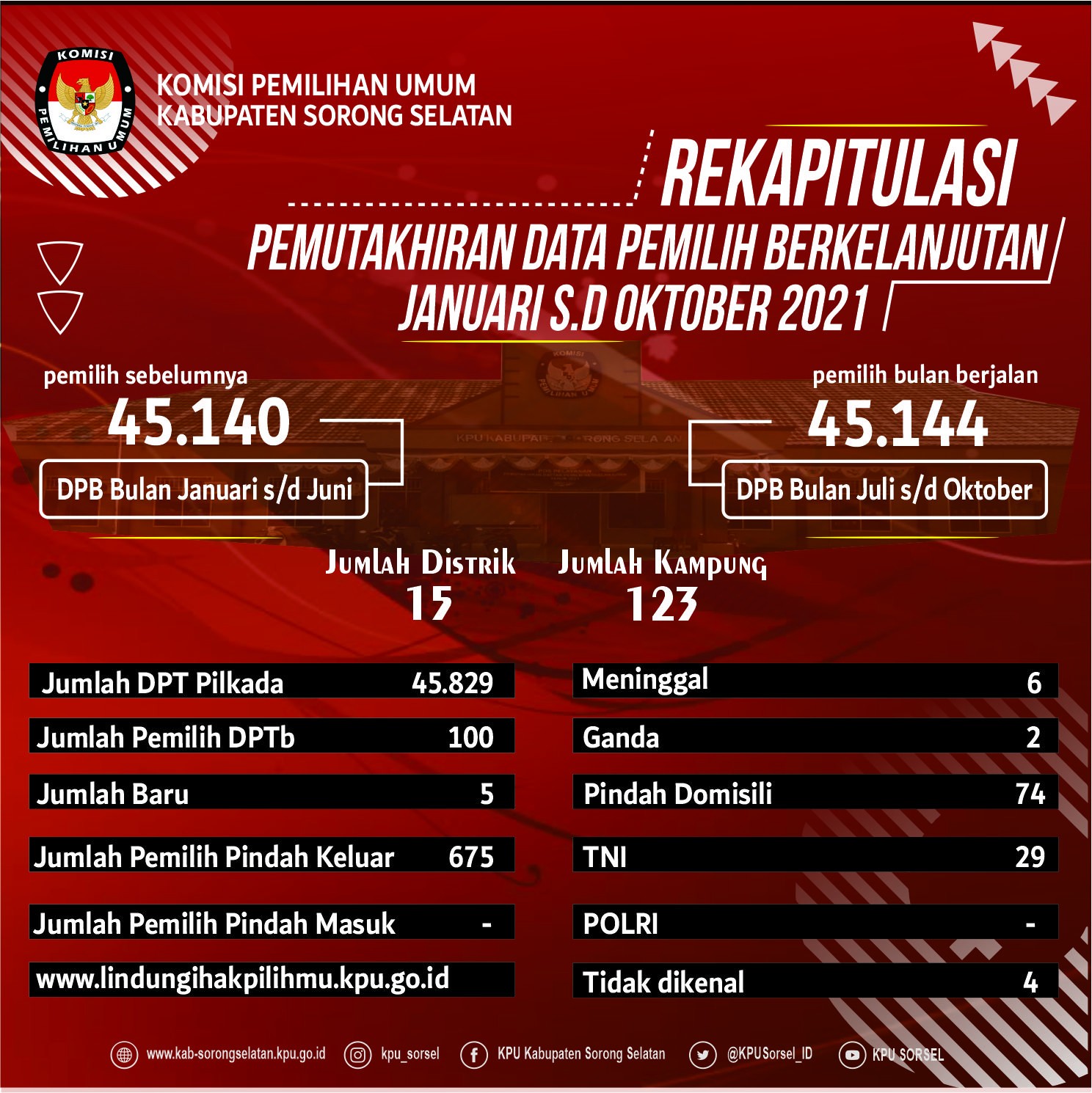 Jumlah Data Pemilih Berkelanjutan Kabupaten Sorong Selatan per Bulan Oktober Tahun 2021 adalah 45.144 Pemilih yang tersebar di 15 Distrik dan 123 Kampung.