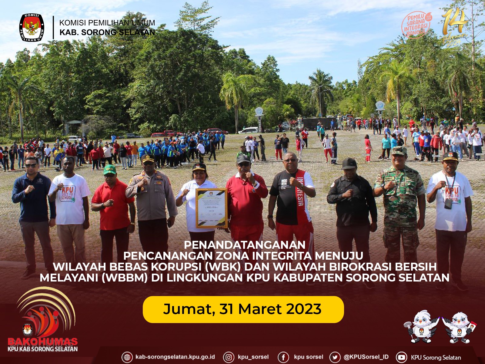 #TemanPemilih, Berdasarkan surat edaran nomor 252/PW.02-SD/11/2023, tentang Pencanangan dan Pembangunan Zona Integritas Menuju Wilayah Bebas dari Korupsi (WBK) dan wilayah birokrasi bersih dan melayani (WBBM), maka jumat (31/03/2023) Komisi Pemilihan Umum Kabupaten Sorong Selatan melaksanakan Pencanangan Pembangunan Zona Integritas di wilayah kerja menuju wilayah bebas korupsi (WBK) dan Wilayah Birokrasi Bersih Melayani (WBBM). Pelaksanaan pencanangan zona integritas tersebut berdasar pada Peraturan Menteri Pendayaagunaan Aparatur Negara dan Reformasi Birokrasi Republik Indonesia Nomor 90 Tahun 2021 tentang Pembangunan dan Evaluasi Zona Integritas Menuju Wilayah Bebas dari Korupsi dan Wilaya Birokrasi Bersih dan Melayani di Instansi Pemeritah.