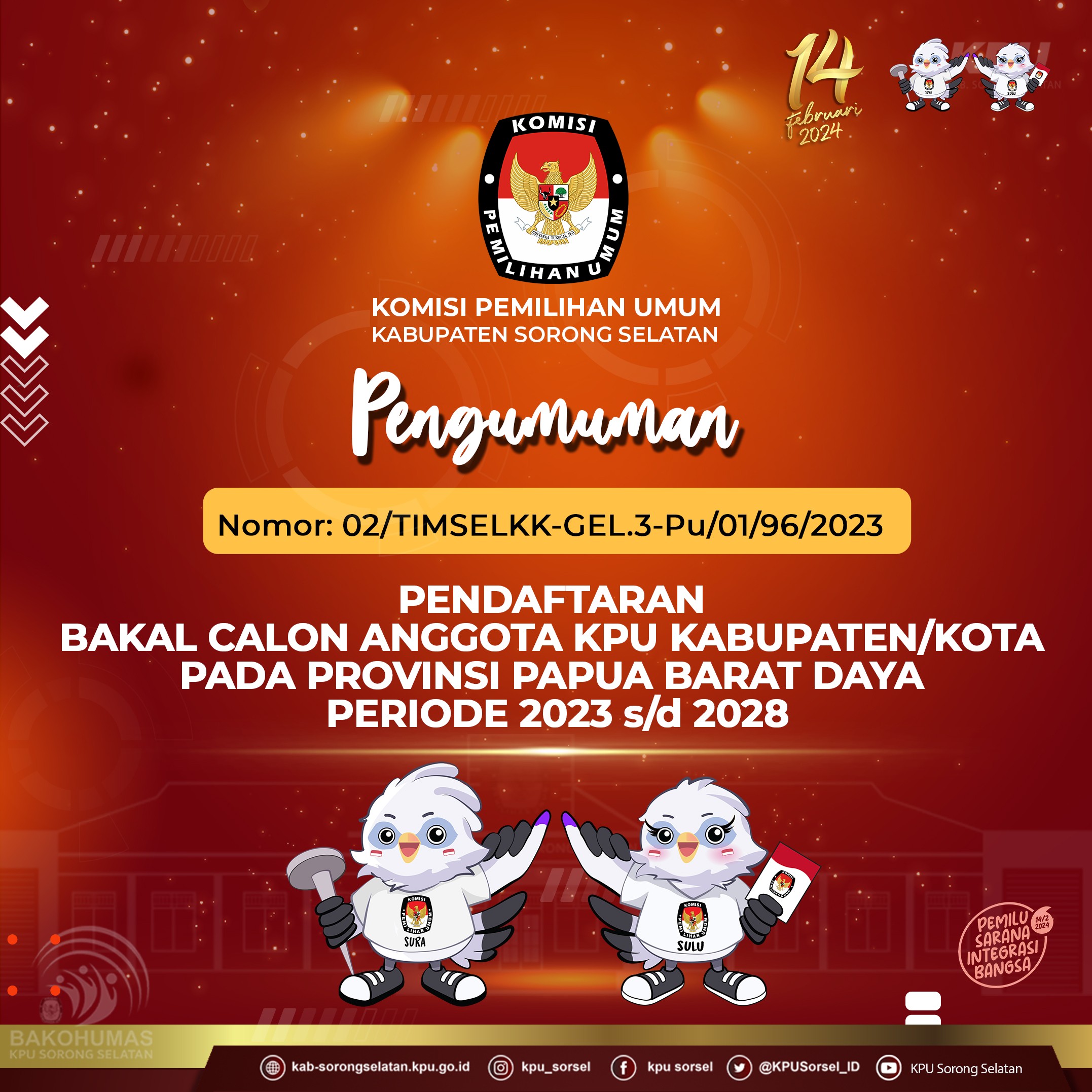 Berdasarkan Keputusan KPU Nomor 204 Tahun 2023 tentang Jadwal Tahapan Seleksi Calon Anggota KPU Provinsi Pada 1 (Satu) Provinsi Dan Calon Anggota KPU Kabupaten/Kota Pada 26 (Dua Puluh Enam) Kabupaten/Kota Di 5 (Lima) Provinsi Periode 2023 s/d 2028, dengan ini Tim Seleksi Calon Anggota KPU Kabupaten/Kota Pada Papua Barat Daya Periode 2023 s/d 2028 mengundang Warga Negara Indonesia yang memenuhi persyaratan untuk mendaftarkan diri menjadi Calon Anggota KPU Kabupaten/Kota: