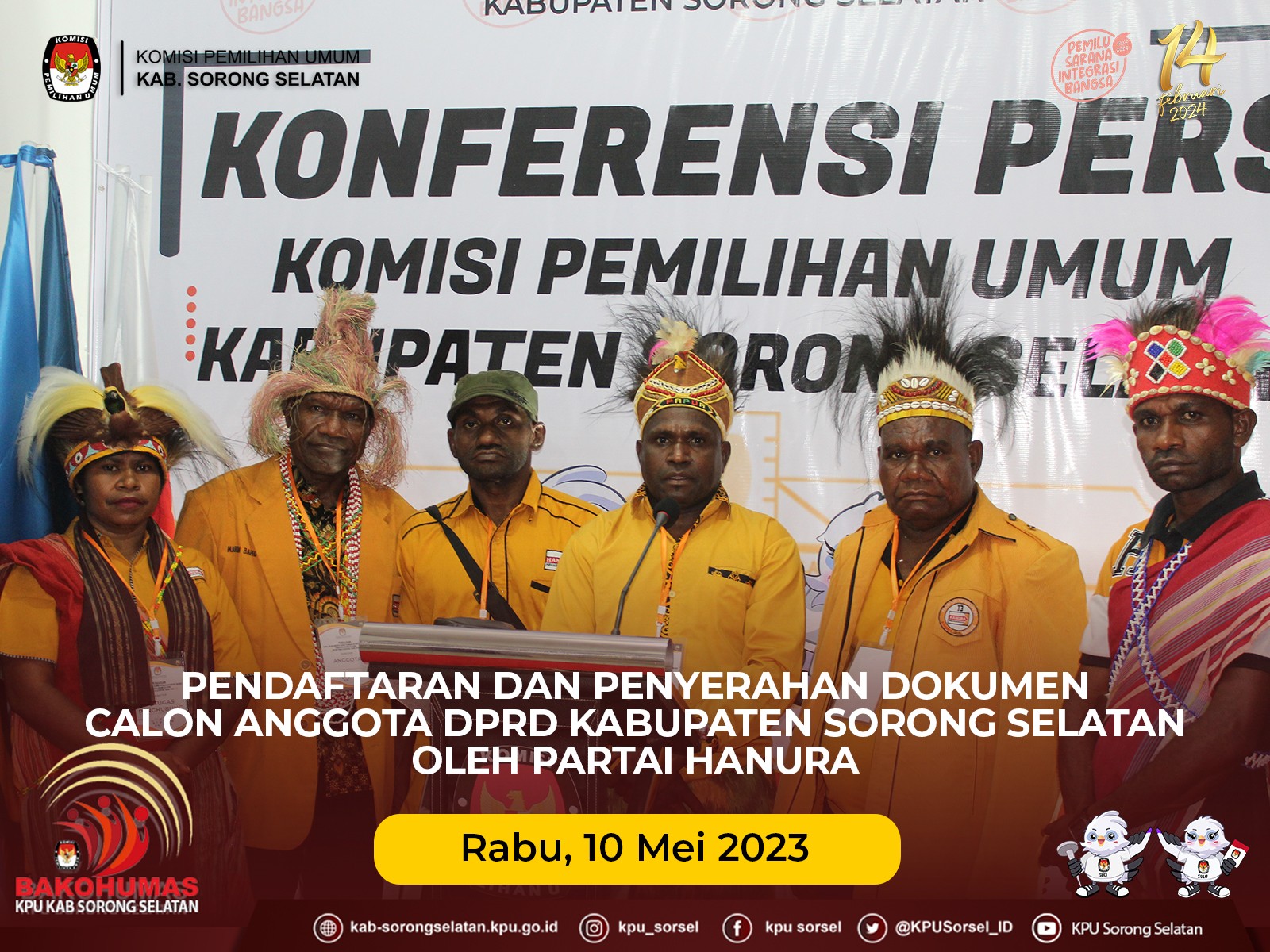 #TemanPemilih, hari ini, Rabu (010/05/2023) Pukul 13.00 WIT KPU kabupaten sorong selatan menerima kehadiran Partai Hanura dalam rangka pengajuan bakal calon anggota DPRD dikabupaten Sorong Selatan. Kedatangan Partai Hanura bersama rombongan dan pendukunganya tampak memenuhi halaman kantor. Partai Hanura disambut oleh Sekretaris KPU Kabupaten Sorong Selatan, Bpk Rusdianto, yang mengarahkan untuk menuju ke meja registarasi.