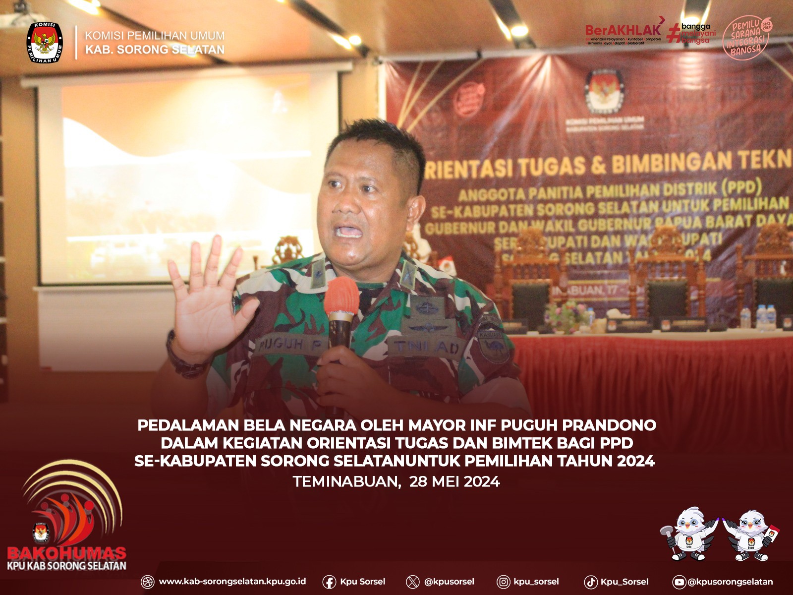 #Temanpemilih, hadir dalam kegiatan orientasi tugas dan bimtek PPD se-Kabupaten Sorong Selatan pada selasa (28/05) di hotel Maratua Sesna, Kasdim 1807 Sorong Selatan, Mayor inf. Puguh Prandono. Pada kesempatan tersebut, beliau memaparkan materi terkait Pentingnya memiliki Rasa Bela Negara pada setiap individu. Selain itu, beliau juga memberikan pembekalan materi Hak-Hak Kewajiban Warga Negara Indonesia serta menyampaikan contoh-contoh kegiatan yang maksud dalam aksi bela negara (humas kpu sorsel patma/foto: Dinda)