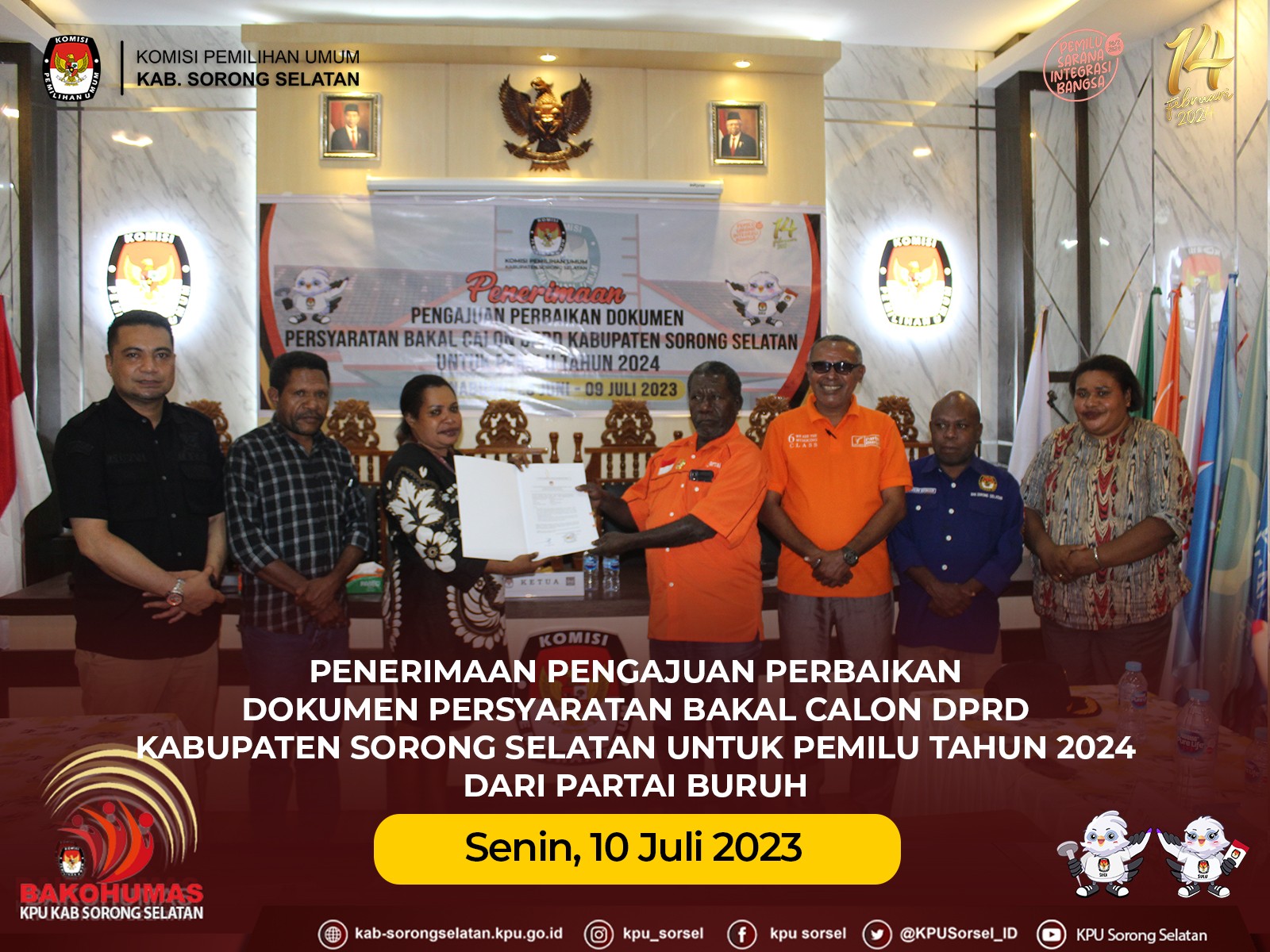 PENERIMAAN PENGAJUAN PERBAIKAN DOKUMEN PERSYARATAN BAKAL CALON DPRD KABUPATEN SORONG SELATAN UNTUK PEMILU TAHUN 2024 DARI PARTAI BURUH
