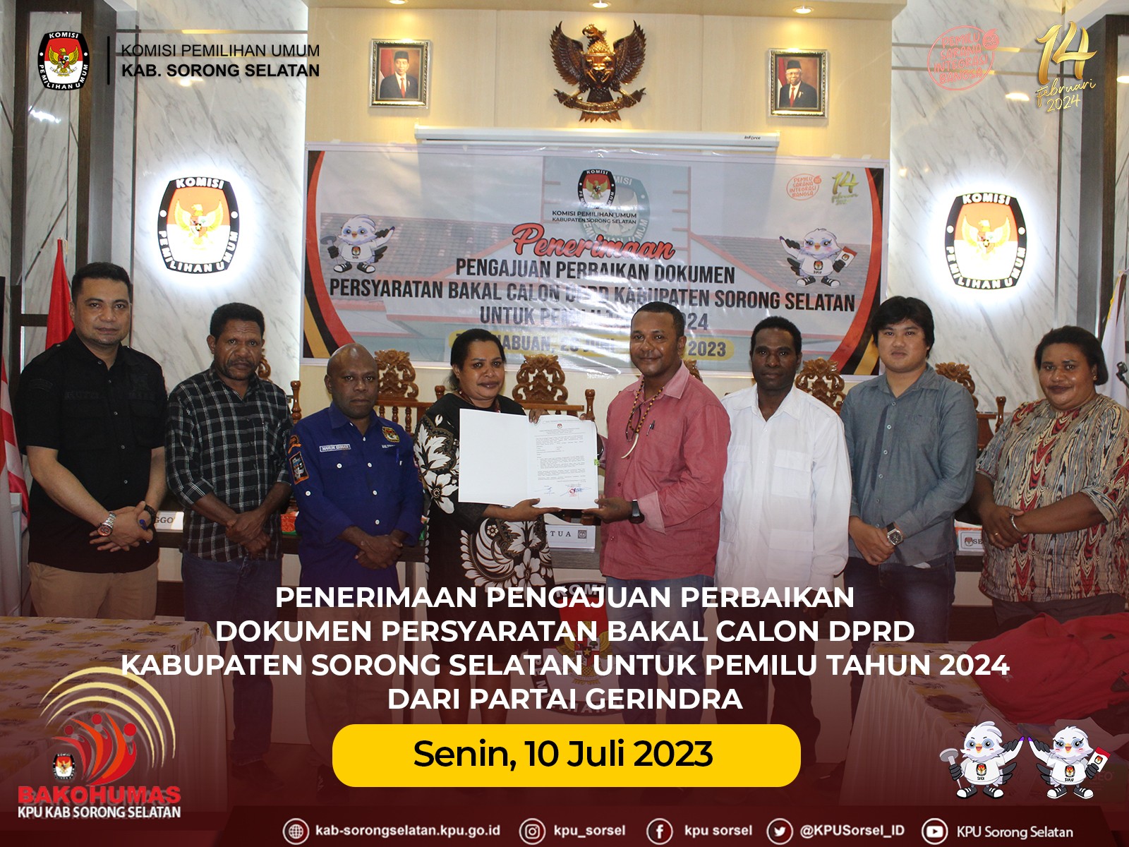 KPU Kab Sorong Selatan telah menerima pengajuan perbaikan dokumen persyaratan bakal calon anggota DPRD Kab. Sorong Selatan dari Partai Gerindra pada hari Minggu (09/07/2023) kemarin. Penerimaan berkas pengajuan perbaikan dilakukan di aula sekretariat KPU Kab. Sorong Selatan. Kegiatan tersebut dihadiri oleh Ketua dan Anggota KPU Kab. Sorong Selatan, Sekretaris KPU Kab. Sorong Selatan, Bawaslu Kab. Sorong Selatan, Ketua, Operator dan Anggota Partai Gerindra serta staf sekretariat.