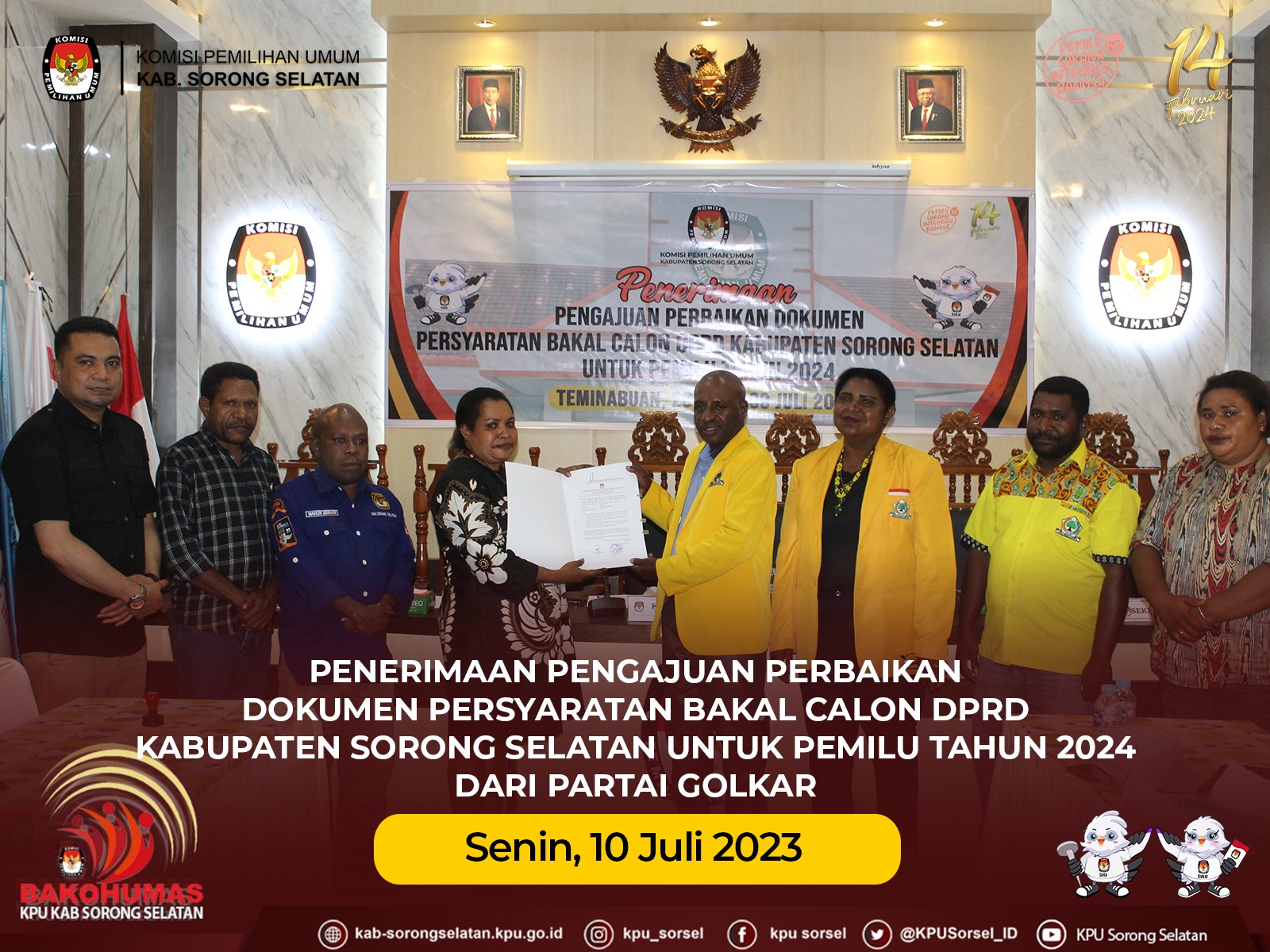 PENERIMAAN PENGAJUAN PERBAIKAN DOKUMEN PERSYARATAN BAKAL CALON DPRD KABUPATEN SORONG SELATAN UNTUK PEMILU TAHUN 2024 DARI PARTAI GOLKAR