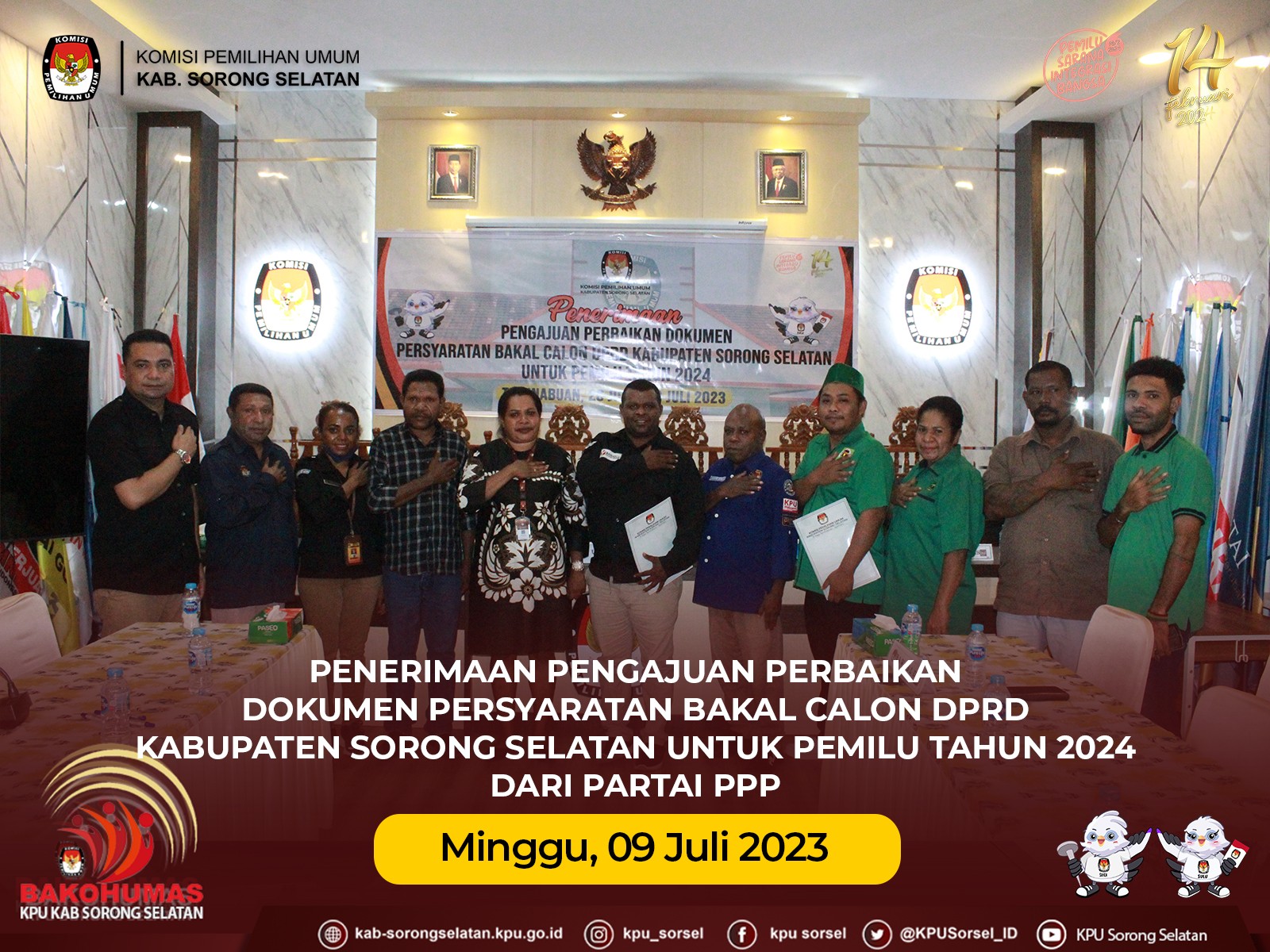 Minggu (09/07/2023) KPU Kab Sorong Selatan menerima pengajuan perbaikan dokumen persyaratan bakal calon anggota DPRD Kab. Sorong Selatan dari Partai PPP. Penerimaan berkas pengajuan perbaikan dilakukan di aula sekretariat KPU Kab. Sorong Selatan. Turut hadir Ketua dan Anggota KPU Kab. Sorong Selatan, Sekretaris KPU Kab. Sorong Selatan, Bawaslu Kab. Sorong Selatan, Peserta Bacaleg dari partai PPP serta staf sekretariat.