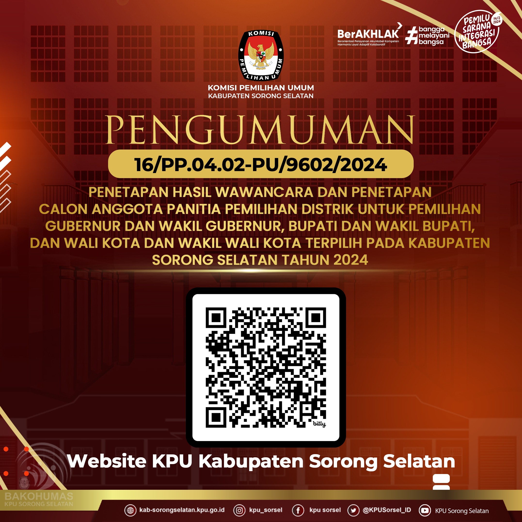 Sehubungan dengan Komisi Pemilihan Umum Kabupaten Sorong Selatan telah melaksanakan tahapan Wawancara dan menyelesaikan seluruh tahapan seleksi Calon Anggota Panitia Pemilihan Distrik pada untuk Pemilihan Gubernur dan Wakil Gubernur, Bupati dan Wakil Bupati, dan Wali Kota dan Wakil Wali Kota Tahun 2024, disampaikan beberapa hal sebagai berikut:
