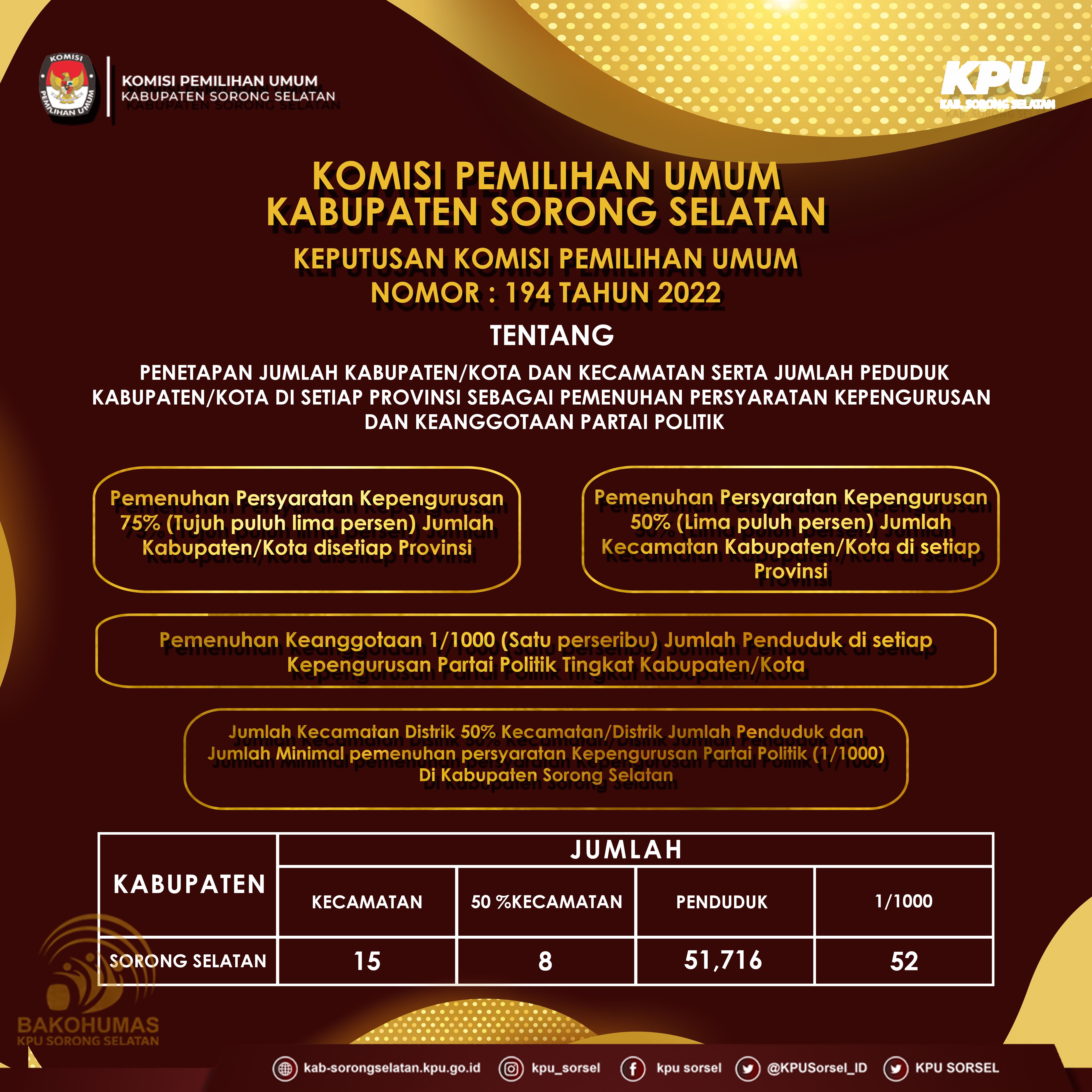 Berdasarkan hasil keputusan Komisi Pemilihan Umum Nomor 194 Tahun 2022 tentang Penetapan Jumlah kabupaten/Kota dan Kecamatan serta Jumlah Penduduk Kabupaten/Kota di setiap provinsi sebagai pemenuhan persyaratan kepengurusan dan keanggotaan partai politi, Berikut adalah jumlah pemenuhan kecamatan dan jumlah penduduk untuk Kabupaten Sorong Selatan.