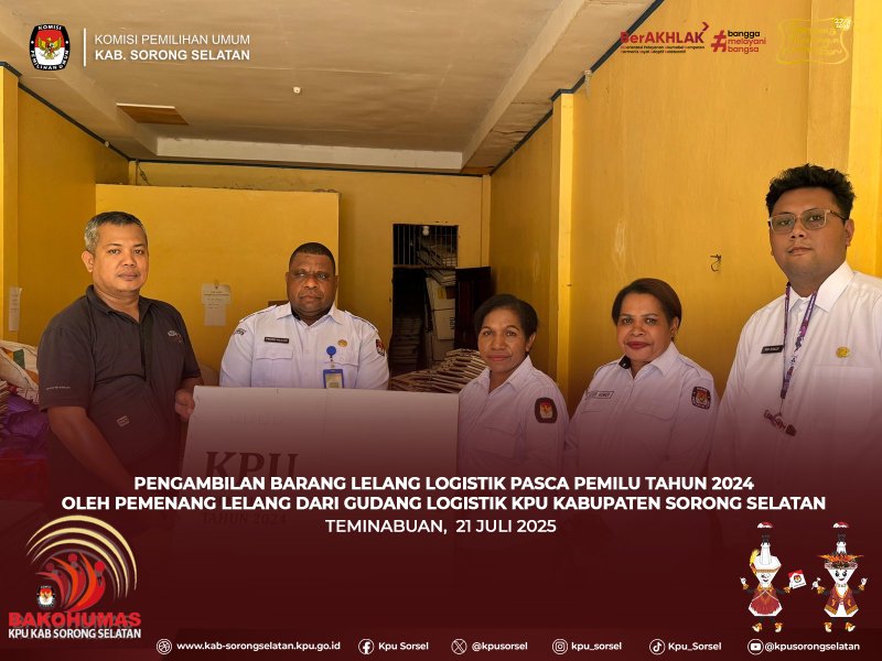 #Temanpemilih, Senin, tanggal 21 Juli 2025, telah dilaksanakan kegiatan pengambilan barang hasil lelang logistik pasca Pemilu Tahun 2024 oleh pemenang lelang di Gudang Logistik KPU Kabupaten Sorong Selatan yang berlokasi di kelurahan keyen, teminabuan. Kegiatan ini merupakan tindak lanjut dari proses lelang yang telah diselenggarakan.