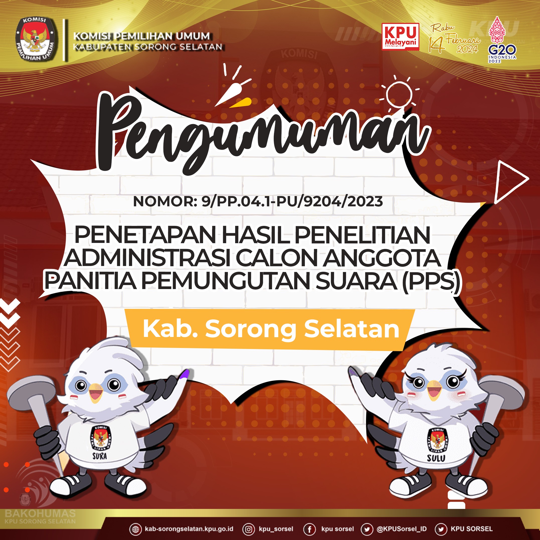 Berdasarkan berita acara rapat pleno KPU Kabupaten Sorong Selatan Nomor 6/PP.04.1-BA/3507/2023 tanggal 07 Januari 2023 tentang Penetapan Hasil Penelitian Administrasi Panitia Pemungutan Suara (PPS) untuk Pemilihan Umum Tahun 2024, maka disampaikan hal-hal sebagai berikut: