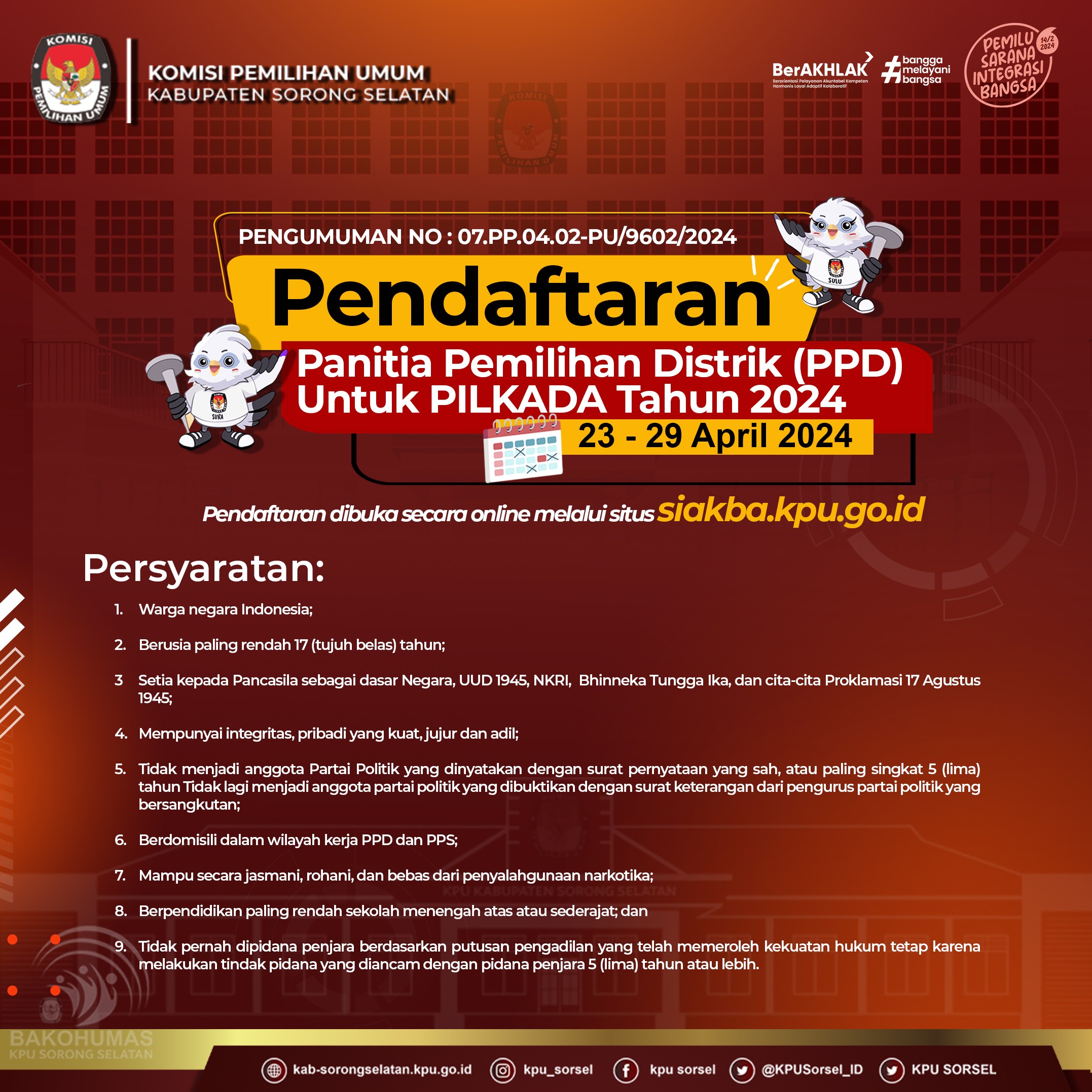 PENGUMUMAN PENDAFTARA PANITIA PEMILIHAN DISTRIK (PPD) UNTUK PEMILIHAN TAHUN 2024
