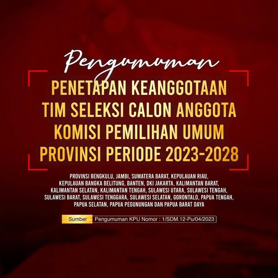 Jakarta, kpu.go.id - Pengumuman Nomor: 1/SDM.12-Pu/04/2023 tentang Penetapan Keanggotaan Tim Seleksi Calon Anggota Komisi Pemilihan Umum Provinsi Bengkulu, Jambi, Sumatera Barat, Kepulauan Riau, Kepulauan Bangka Belitung, Banten, DKI Jakarta, Kalimantan Barat, Kalimantan Selatan, Kalimantan Tengah, Sulawesi Utara, Sulawesi Tengah, Sulawesi Barat, Sulawesi Tenggara, Sulawesi Selatan, Gorontalo, Papua Tengah, Papua Selatan, Papua Pegunungan, dan Papua Barat Daya Periode 2023-2028.