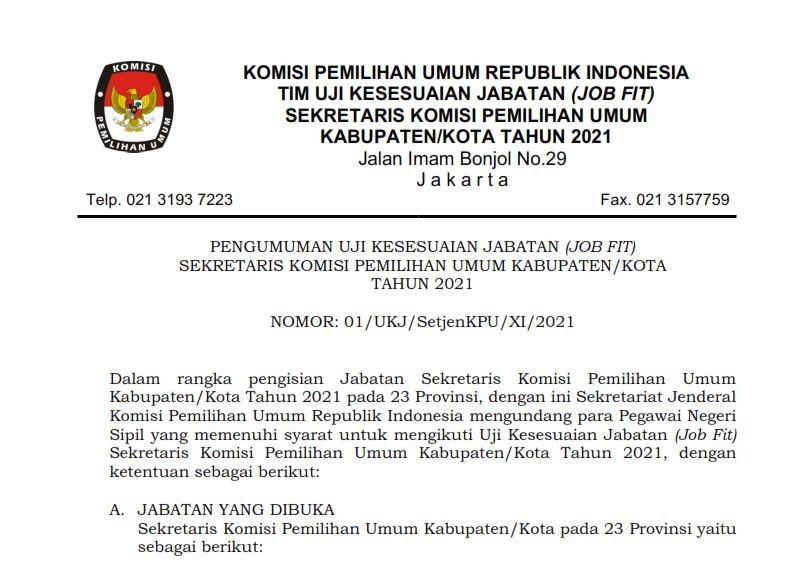Pengumuman Uji Kesesuaian Jabatan (Job Fit) Sekretaris KPU Kabupaten/Kota Tahun 2021