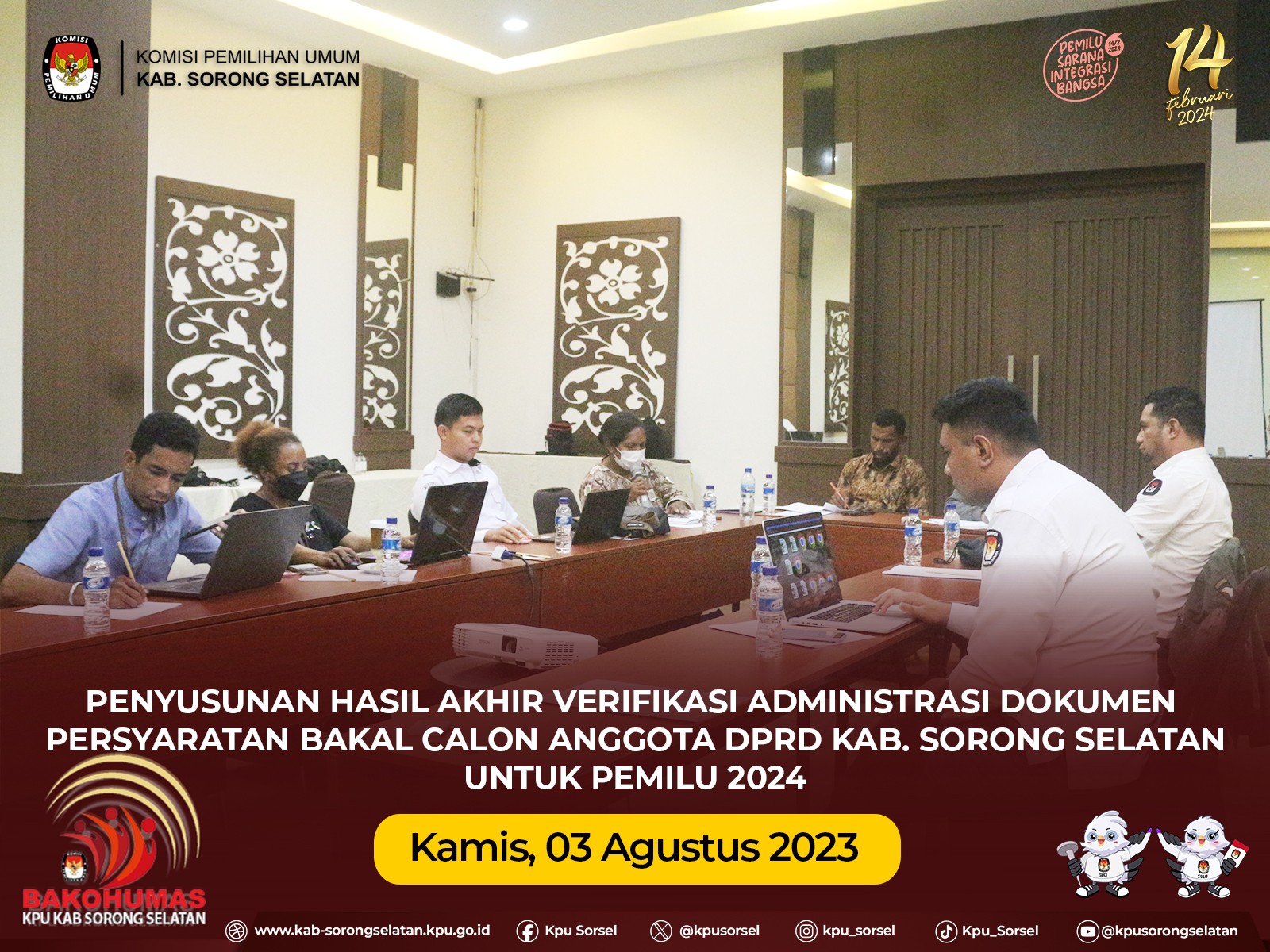 #TemanPemilih, berdasarkan Keputusan Komisi Pemilihan Umum Nomor 403 Tahun 2023, tentang program dan jadwal kegiatan tahapan verifikasi administrasi dokumen persyaratan bakal calon anggota DPR, DPRD Provinsi, dan DPRD Kab/Kota untuk Pemilu 2024, kamis (03/08/2023) KPU Kabupaten Sorong Selatan melakukan kegiatan penyusunan hasil akhir verifikasi administrasi dokumen persyaratan untuk bakal calon anggota DPRD Kab sorong selatan.