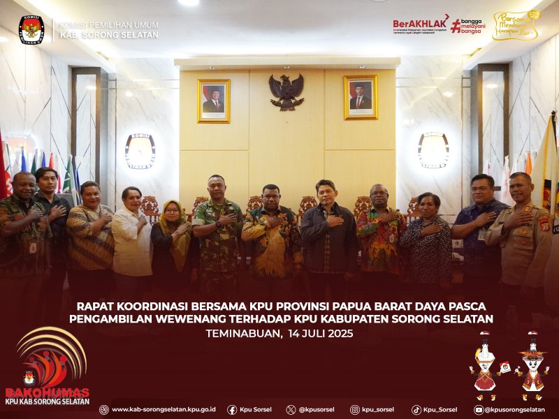 Teminabuan — Kamis, 10 Juli 2025, KPU Provinsi Papua Barat Daya bersama KPU Kab. Sorong Selatan menggelar rapat koordinasi bersama Forkopimda di Sorong Selatan pasca pengambilalihan sementara wewenang KPU Kab. Sorong Selatan oleh KPU Provinsi. Rapat ini dilaksanakan di Aula Kantor, dan dihadiri oleh sejumlah unsur Forum Koordinasi Pimpinan Daerah (Forkopimda) serta instansi terkait di wilayah Kabupaten Sorong Selatan.
