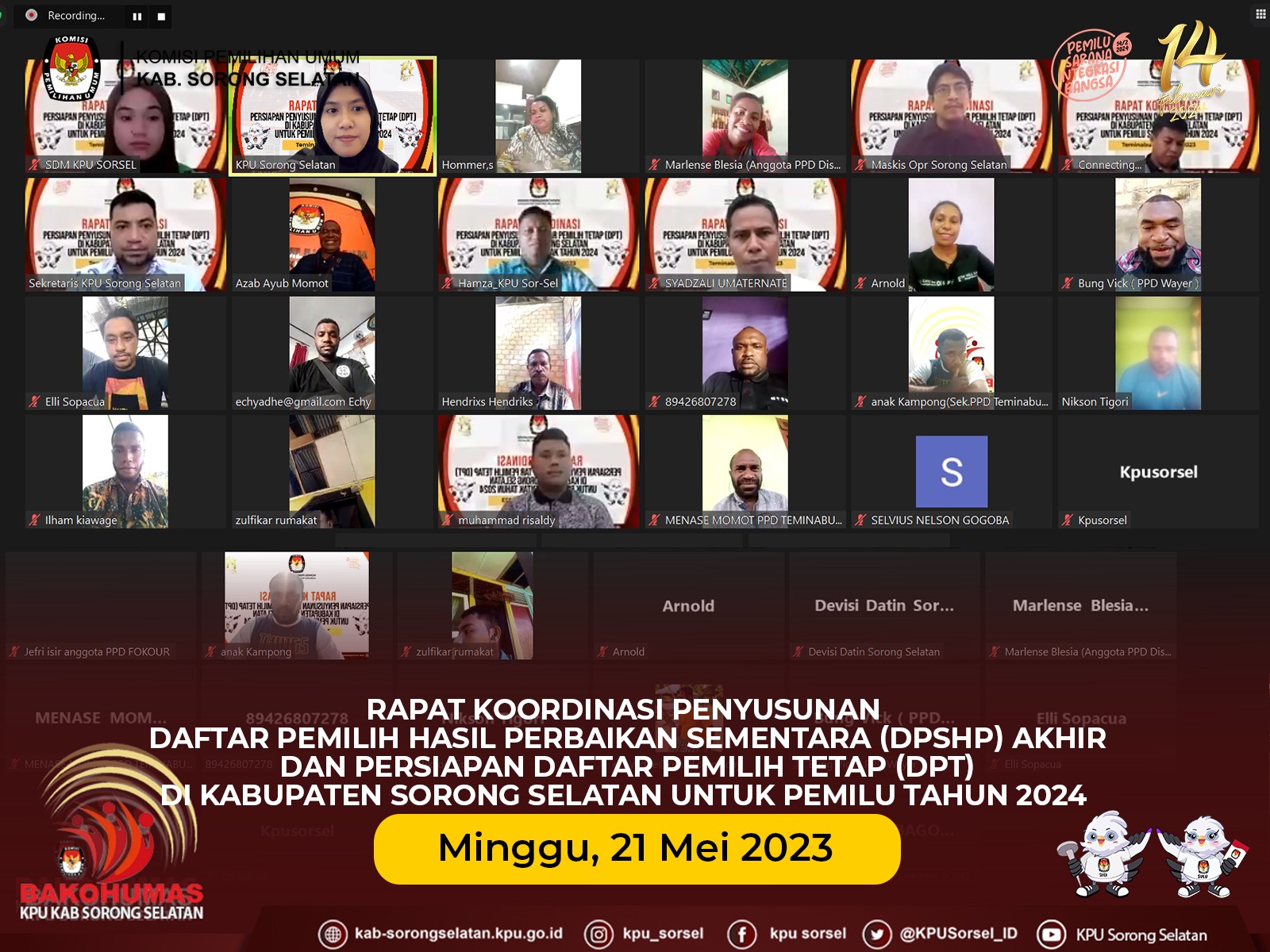 #TemanPemilih, berdasarkan Surat Dinas KPU RI nomor 497/TIM/01-SD/14/2023 serta Peraturan KPU Nomor 7 Tahun 2023,maka KPU Kabupaten Sorong Selatan mengadakan rapat koordinasi untuk Penyusunan Daftar Pemilih Hasil Perbaikan Sementara (DPSHP) Akhir dan Persiapan Daftar Pemilih Tetap (DPT) Pemilu tahun 2024 secara daring via zoom pada hari minggu 21/5/2023.
