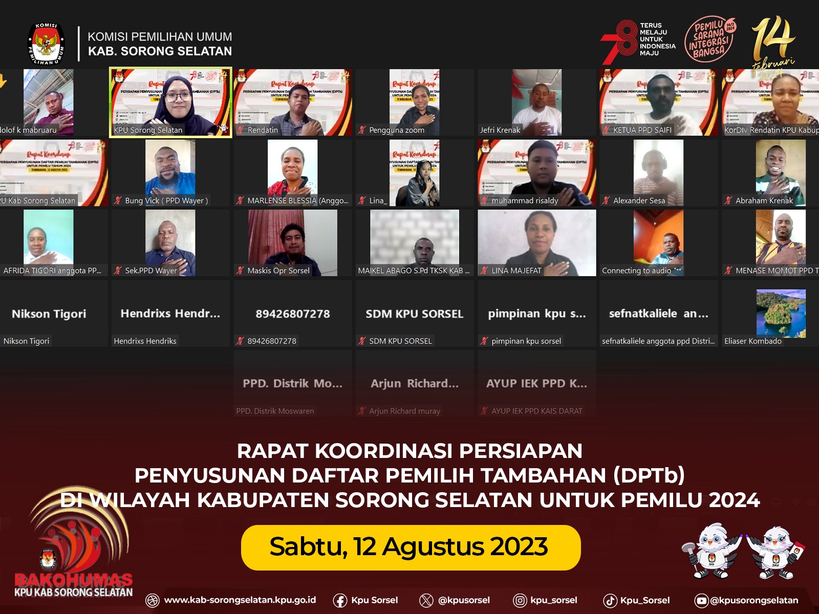 Rapat yang dilakukan secara daring tersebut dihadiri oleh Kordiv Rendatin KPU Provinsi Papua Barat Daya, Jefri Obeth Kambu, Komisioner KPU Kab. Sorong Selatan yakni, Ketua sekaligus Kordiv KUL, Yonce Kambu, Kordiv Rendatin, Federika Muguri, Kordiv Teknik Penyelenggaran Pemilu, Eliaser Kambu dan Kordiv Hukum dan Pengawasan, Yulius Yarollo. Hadir juga Kabag Rendatin KPU Provinsi Papua Barat Daya, Sally sedubun, Sekretaris KPU Kab. Sorong Selatan, Mohammad Rusdi bersama staf sekretariat serta Ketua dan Anggota PPD se-kabupaten Sorong Selatan.