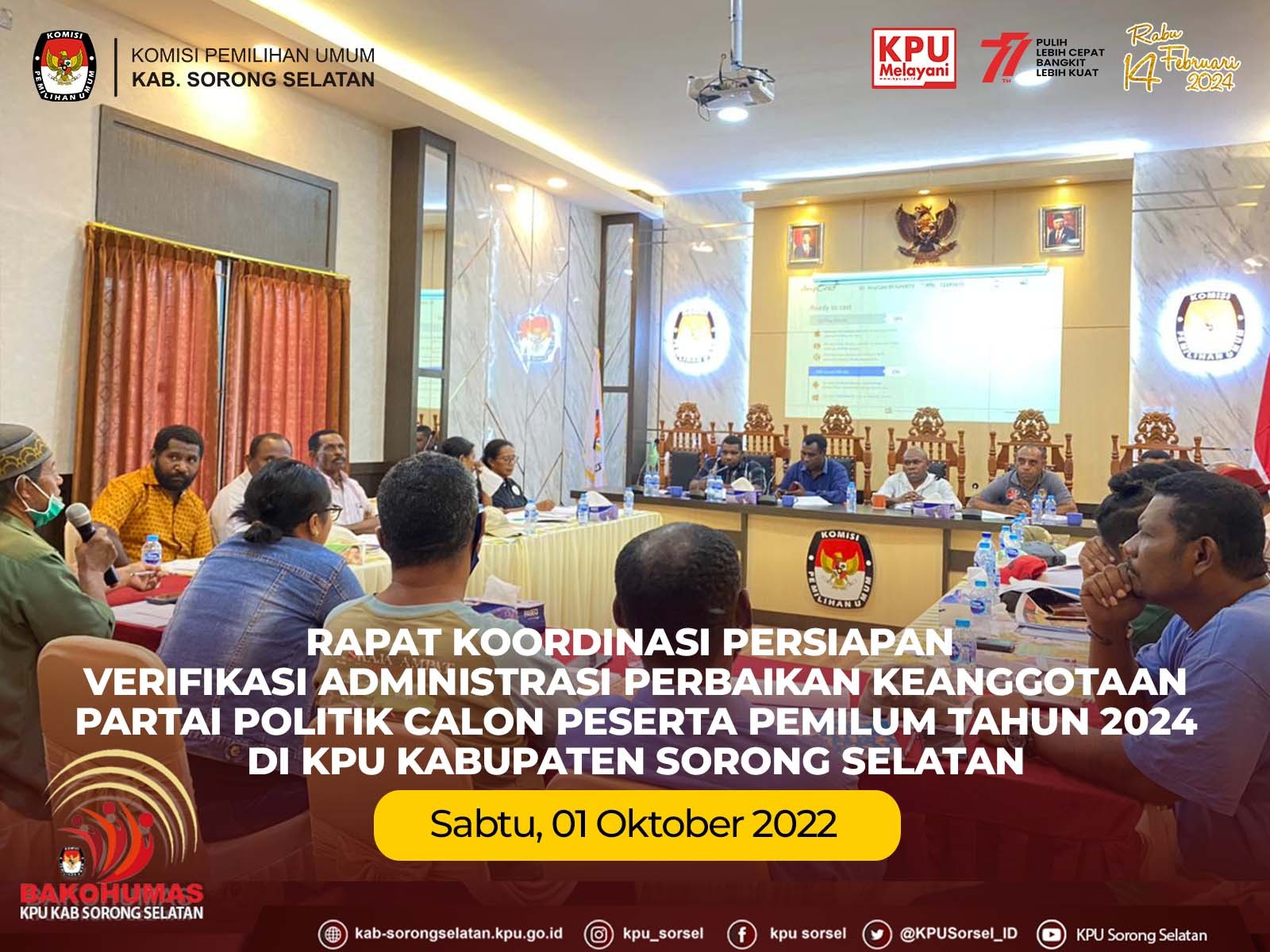 #TemanPemilih, Sabtu 01 Oktober 2022, KPU Kabupaten Sorong Selatan mengadakan kegiatan rapat koordinasi Persiapan Verifikasi Administrasi Perbaikan Keanggotaan partai politik calon peserta pemilu tahun 2024. Rapat yang digelar di sekretariat KPU Kabupaten sorong selatan tersebut, dihadiri oleh jajaran KPU kabupaten Sorong Selatan dan perwakilan dari masing-masing parpol. Rapat tersebut membahas terkait lanjutan dari tahapan verifikasi administrasi parpol calon peserta pemilu tahun 2024.