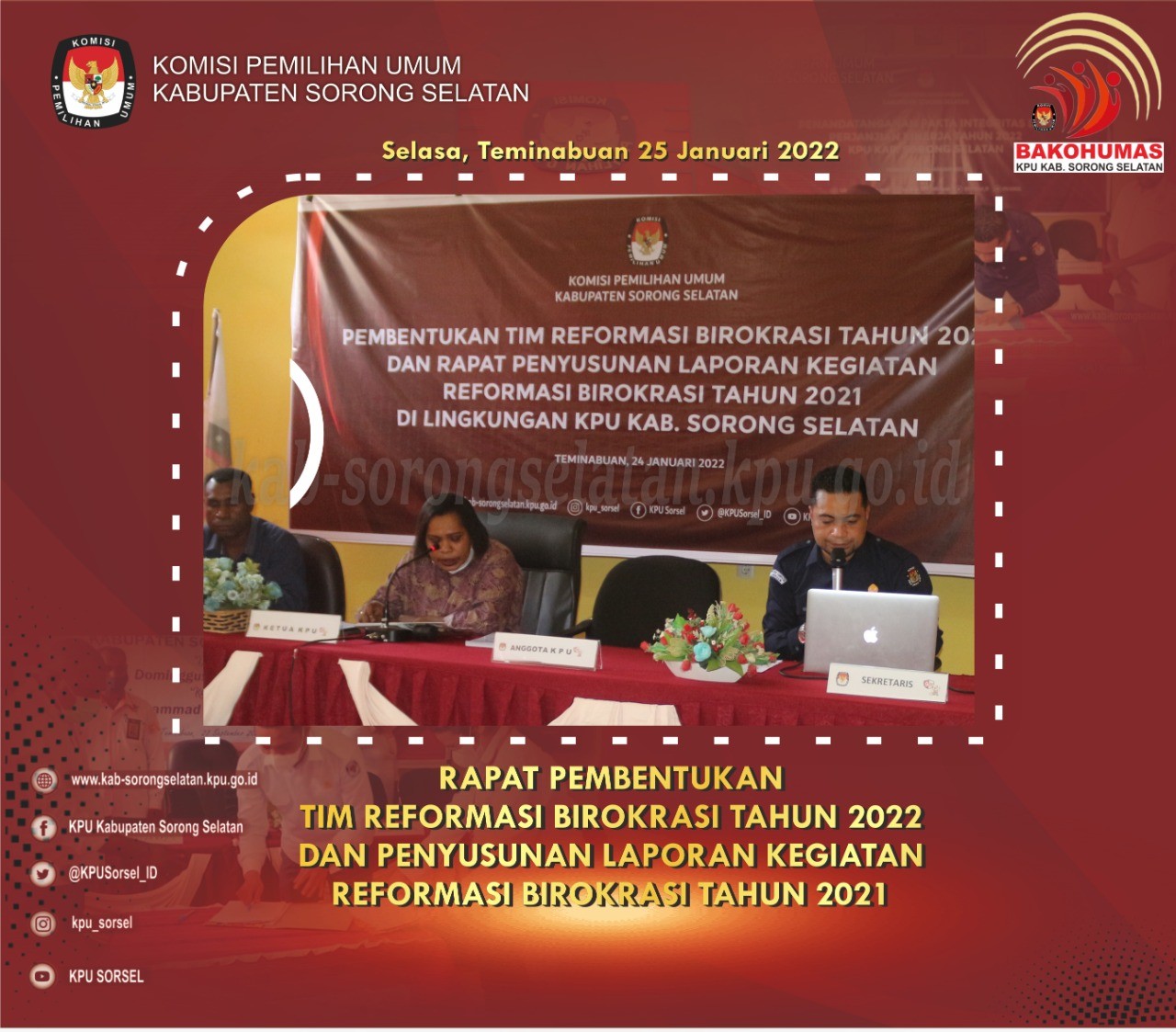 Kpu.Sorsel, Dalam rangka mewujutkan kualitas pelayanan publik dan birokrasi yang bersih dan akuntabel, efektif dan efisien, KPU Kabupaten Sorong Selatan melaksanakan Rapat pembentukan Tim Reformasi Birokrasi Tahun 2022 dan penyusunan laporan kegiatan Reformasi Birokrasi Tahun 2021. Selasa 25/01/2022).