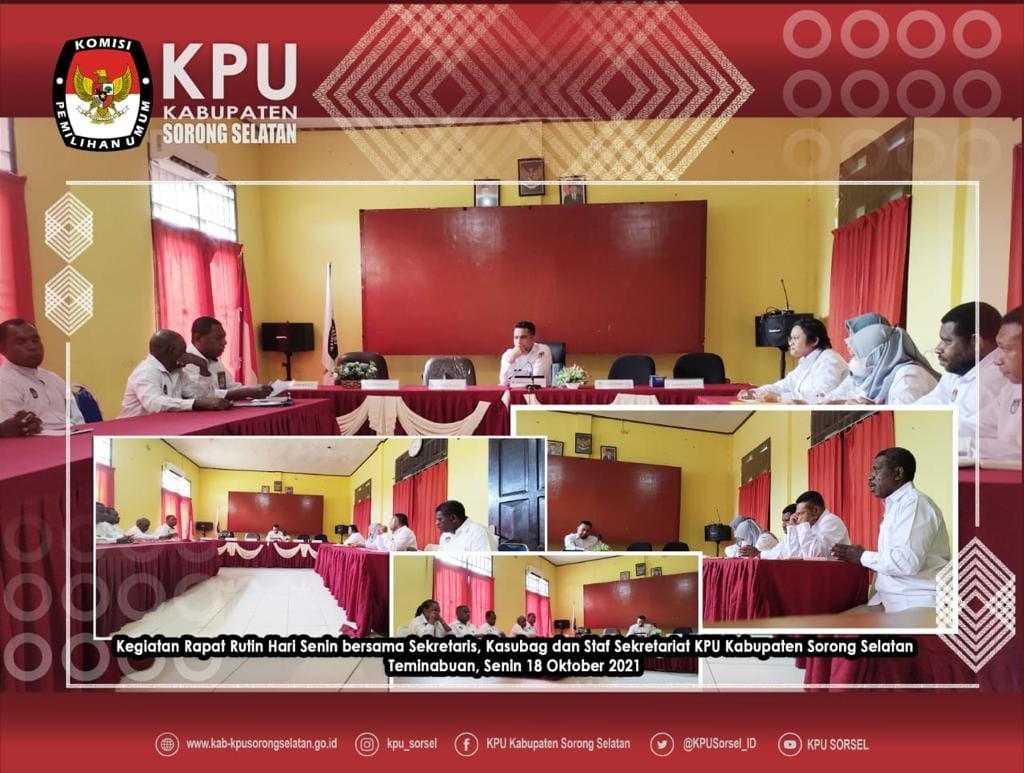 #TemanPemilih, Senin (18/10/2021) KPU Kabupaten Sorong Selatan mengadakan rapat Evaluasi dan konsulidasi pada jajaran Sekretariat yang dipimpin oleh Mohammad Rusdianto SH selaku Sekretaris. Diharapkan dengan kegiatan rapat rutin ini, dapat mengoptimalisasikan tercapainya efisiensi dan produktifitas ASN dalam melaksanakan tugas dilingkungan Sekretariat KPU Kab Sorong Selatan.