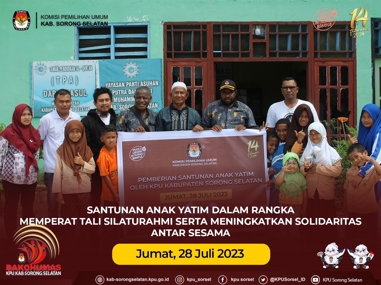 #TemanPemilih, sebagai bentuk kepedulian KPU terhadap generasi dan mempererat tali silaturahmi serta meningkatkan solidaritas antar sesama, KPU Kabupaten Sorong Selatan berbagi santunan anak yatim di Panti Asuhan Muhammadiyah Teminabuan. Kegiatan santunan ini dilaksanakan serentak di Lingkungan KPU pada tanggal 28 Juli 2023.