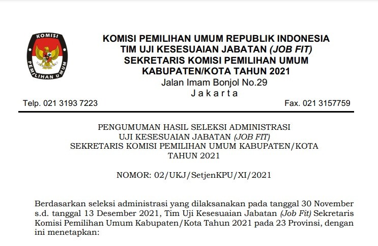 Jakarta, kpu.go.id - Pengumuman Hasil Seleksi Administrasi Uji Kesesuaian Jabatan (Job Fit) Sekretaris Komisi Pemilihan Umum Kabupaten/Kota Tahun 2021, Nomor: 02/UKJ/SetjenKPU/XI/2021.Pengumuman Hasil Seleksi Administrasi Uji Kesesuaian Jabatan (Job Fit) Sekretaris Komisi Pemilihan Umum Kabupaten/Kota Tahun 2021, Nomor: 02/UKJ/SetjenKPU/XI/2021.