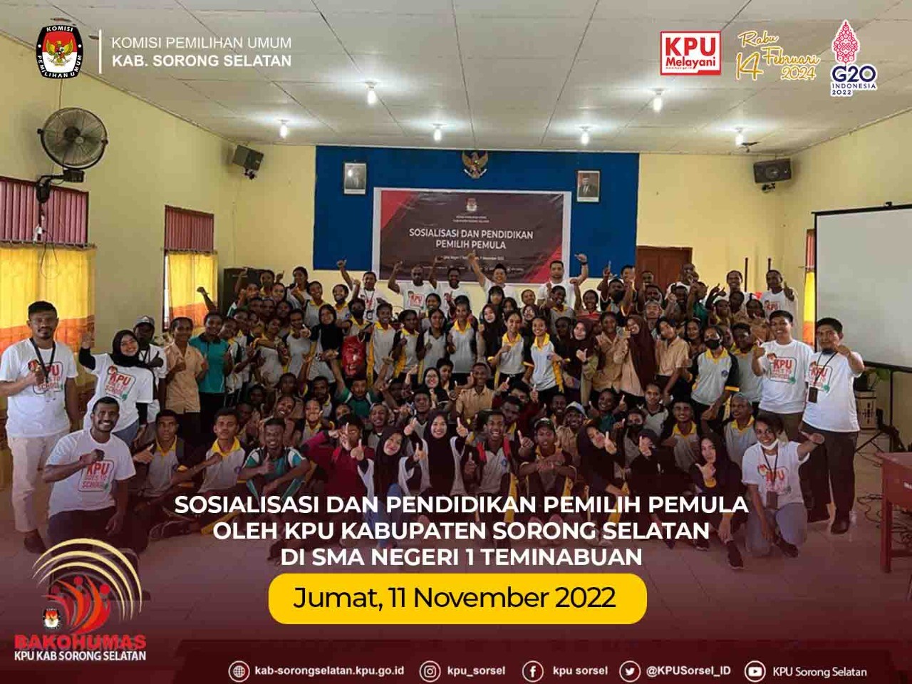 #TemanPemilih, jumat (11/11/22) KPU kabupaten Sorong Selatan menyelenggarakan pendidikan pemilih pemula di SMA Negeri 1 Teminabuan. Arahan umum terkait tujuan dari pelaksanaan kegiatan tersebut disampaikan oleh Anggota KPU Kabupaten Sorong Selatan divisi Sosdiklih parmas dan SDM, Bapak Isak Salamuk, yang sekaligus membuka acara kegiatan sosiaslisasi dan pendidikan pemilih tersebut.
