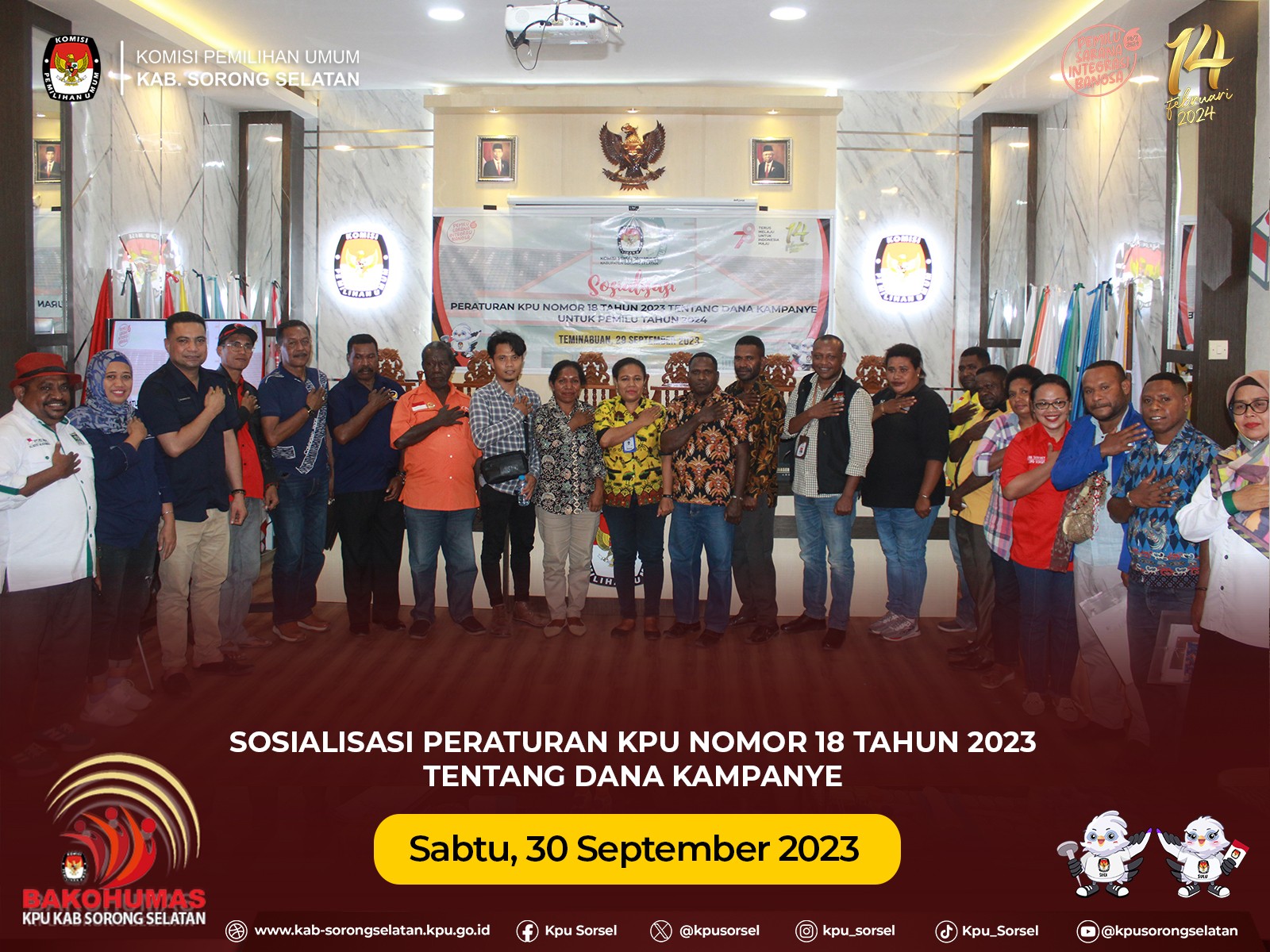 #Temanpemilih, KPU Kab. Sorong Selatan menggelar Sosialisasi Peraturan Komisi Pemilihan Umum Nomor 18 Tahun 2023 Tentang Dana Kampanye pada jumat (29/09/2023) di aula kantor KPU Kab. Sorong Selatan. Pemaparan materi disampaikan oleh Eliaser Kombado selaku komisioner divisi Teknis Penyelenggara Pemilu dengan moderator adalah Sekretaris KPU Kab. Sorong Selatan, Mohammad Rusdi.